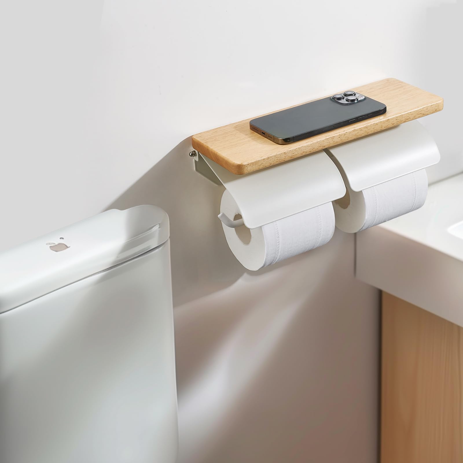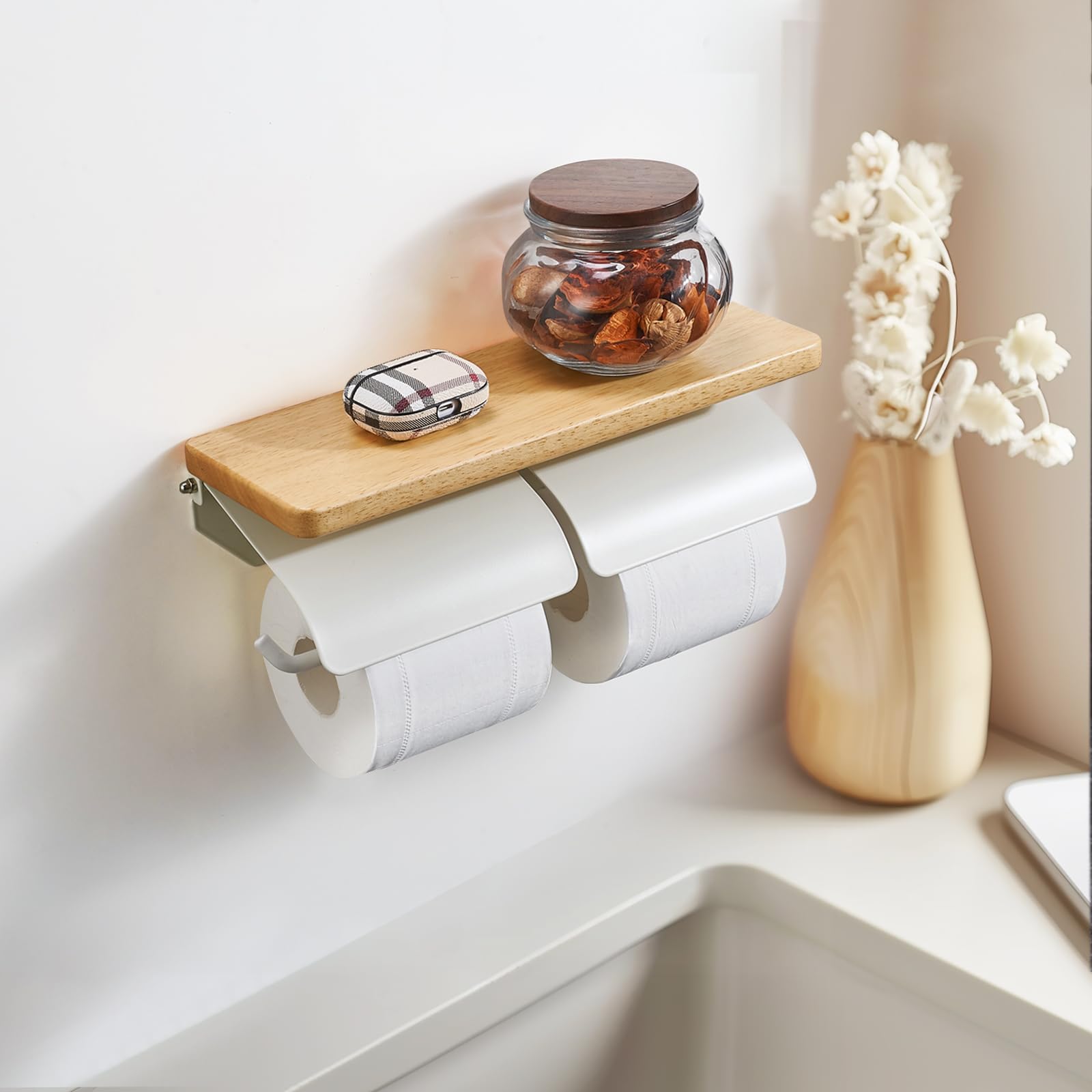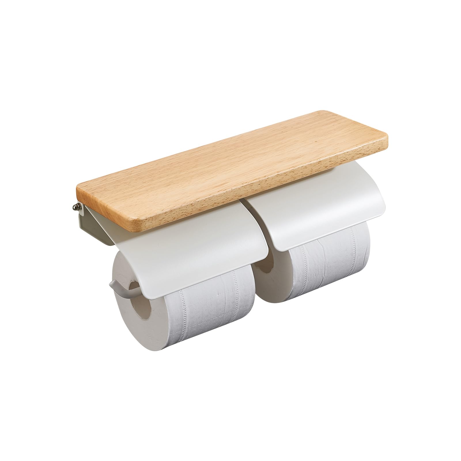 【在庫処分】トイレットペーパーホルダー 天然木 棚付き 片手で切れる おしゃれ 2連 シングル ダブル 2倍巻き 3倍巻き 紙巻器 ホルダー カバー スチール製 アイアン 賃貸対応 トイレ収納(ナチュラル×ホワイト ダブル) | GIGATERA