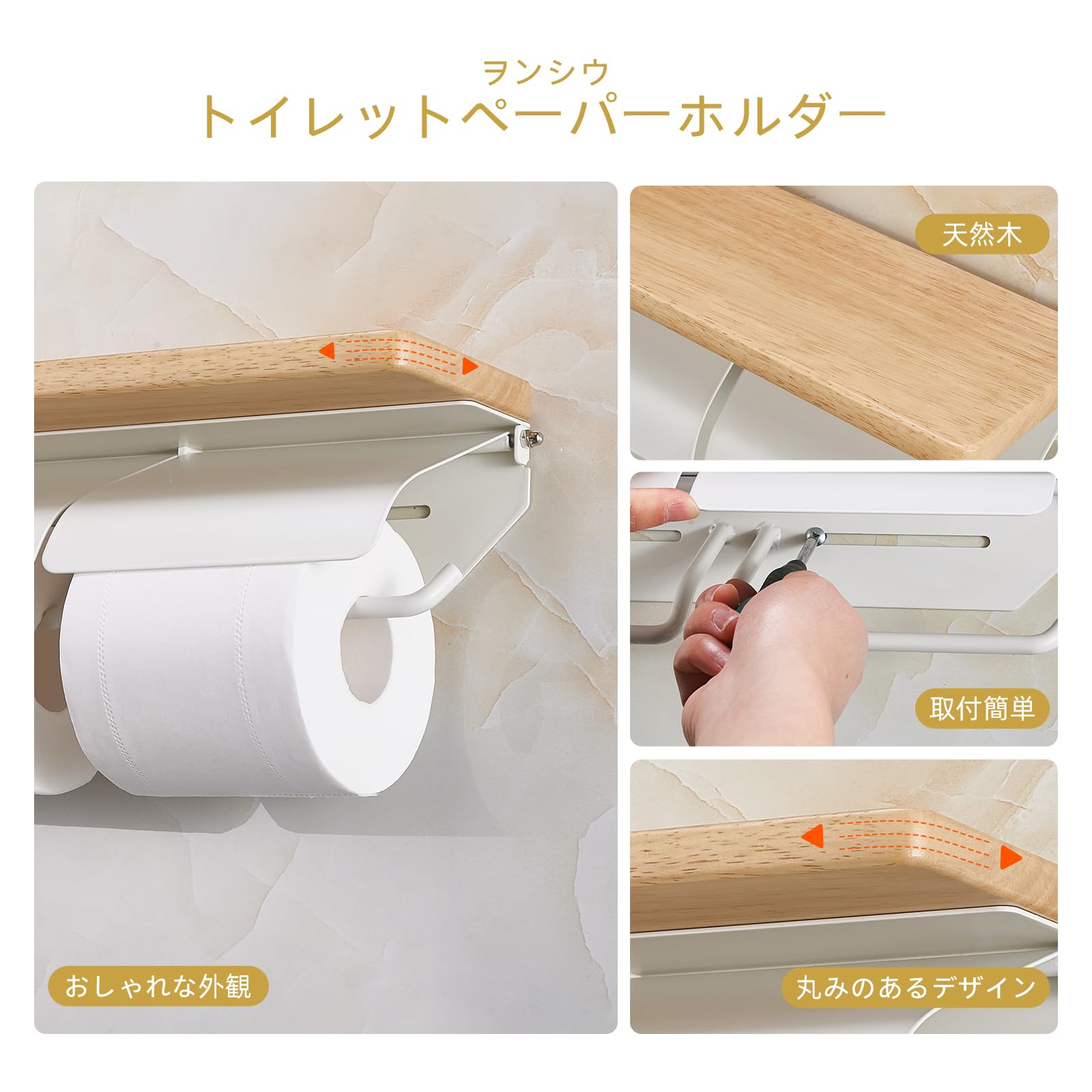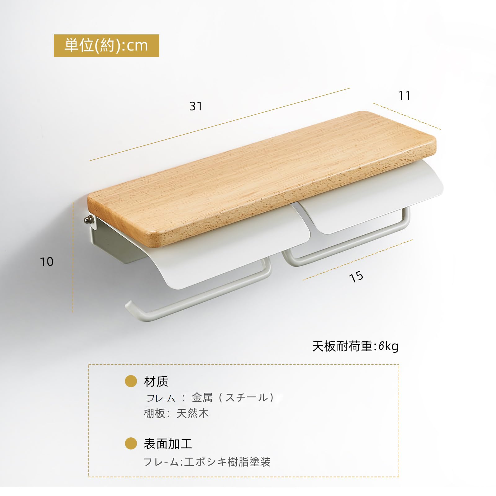 トイレットペーパーホルダー 天然木 棚付き 片手で切れる おしゃれ 2連 シングル ダブル 2倍巻き 3倍巻き 紙巻器 ホルダー カバー スチール製 アイアン 賃貸対応 トイレ収納(ナチュラル×ホワイト, ダブル)