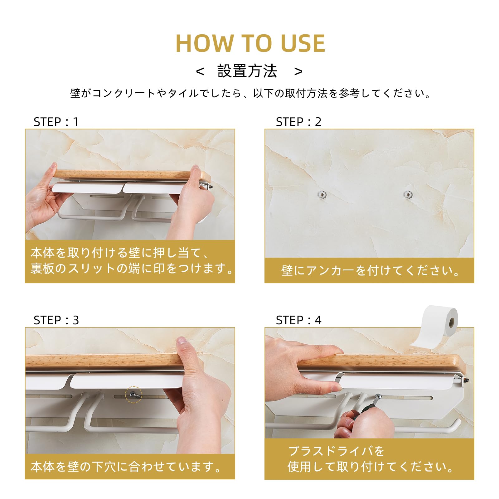 【取付簡単】完成品です、組み立て不要なので、すぐにお使うことができます。このペーパーホルダーが木、タイル、コンクリートなど、ほとんどのものに設置できます。