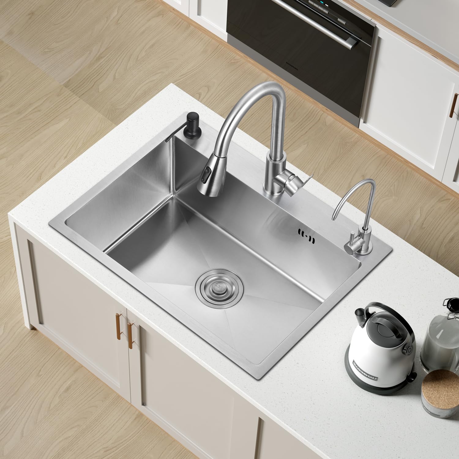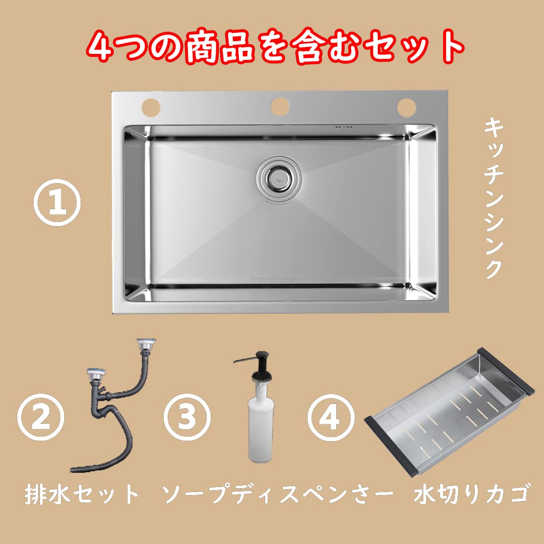【商品仕様】パッケージ内容:シンク本体、排水セット、ソープディスペンサー、水切りカゴを含まる。(注:蛇口は付属しておりませんので、お客様は自分で購入してください。)