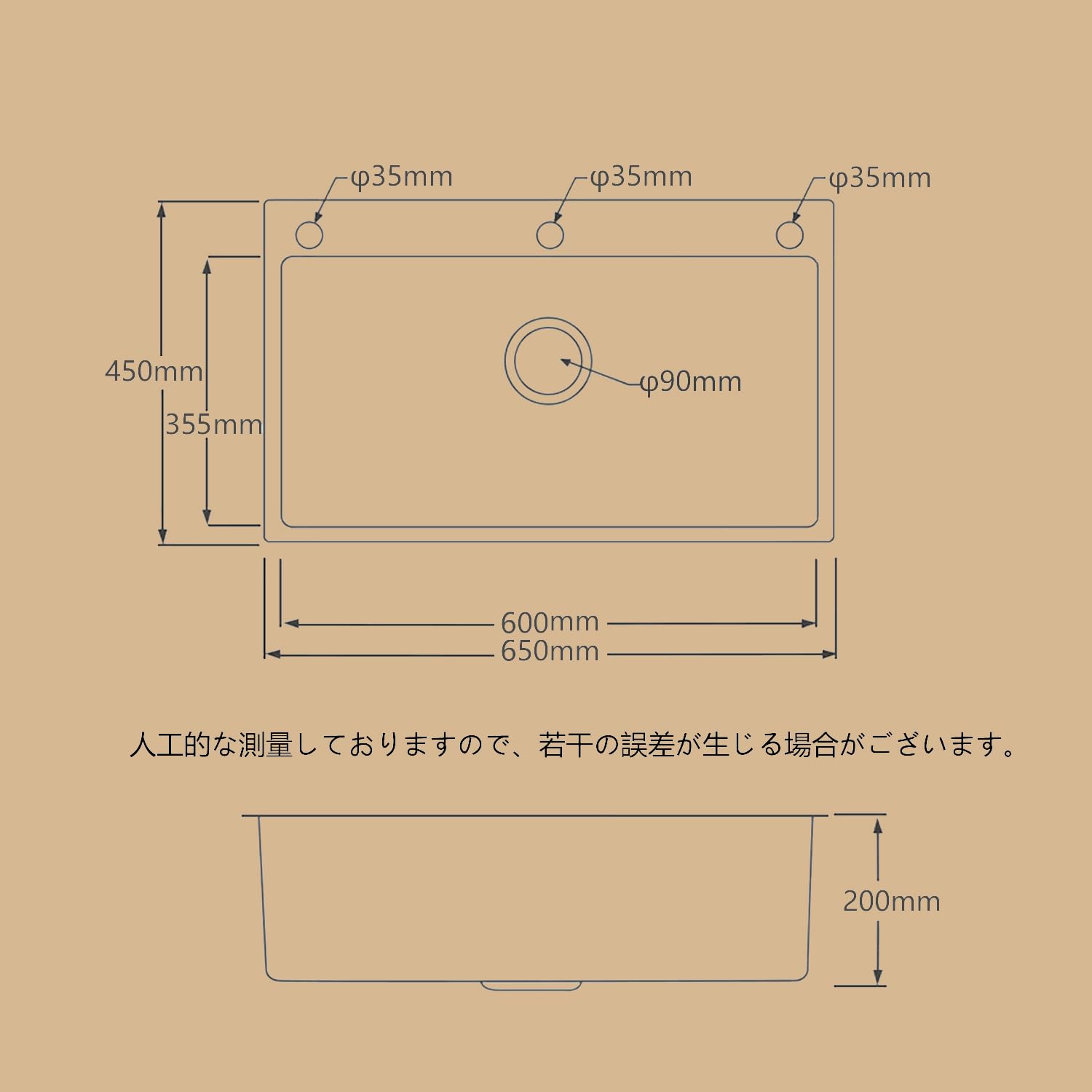 【シンクサイズ】製品外寸:650*450*200mm、内寸:600*355mm、シンク取付穴径:620*420mm、蛇口穴:φ35mm。