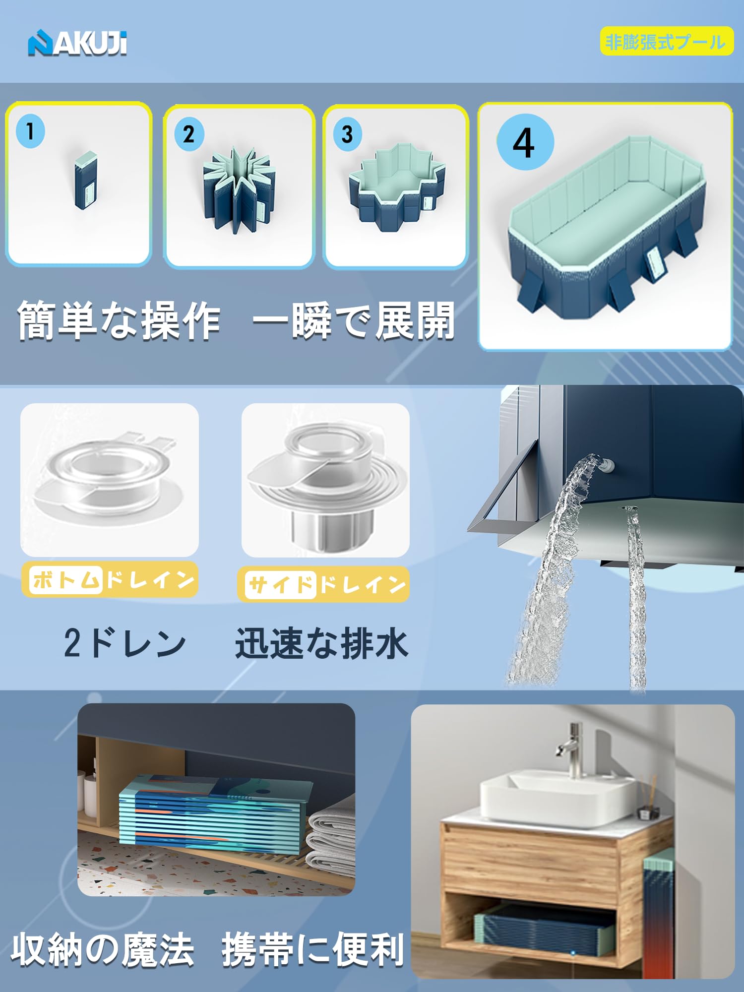 【二重排水口設計・収納便利】新型のノーインストール折りたたみ式ブラケット付きキッズプールは、耐久性の高い設計だけでなく、使い勝手の良さも十分に考慮されています。側面と底面にそれぞれ排水口が設けられており、排水速度が速く、排水作業も簡単かつ徹底的です。さらに、このプールは従来品に見られる排水不十分や清掃の問題を完全に解決しています。このエアレスプールは簡単に折りたため、コンパクトに収納できます。キャンプや旅行の際に持ち運びに便利で、自宅での収納スペースも節約できます。