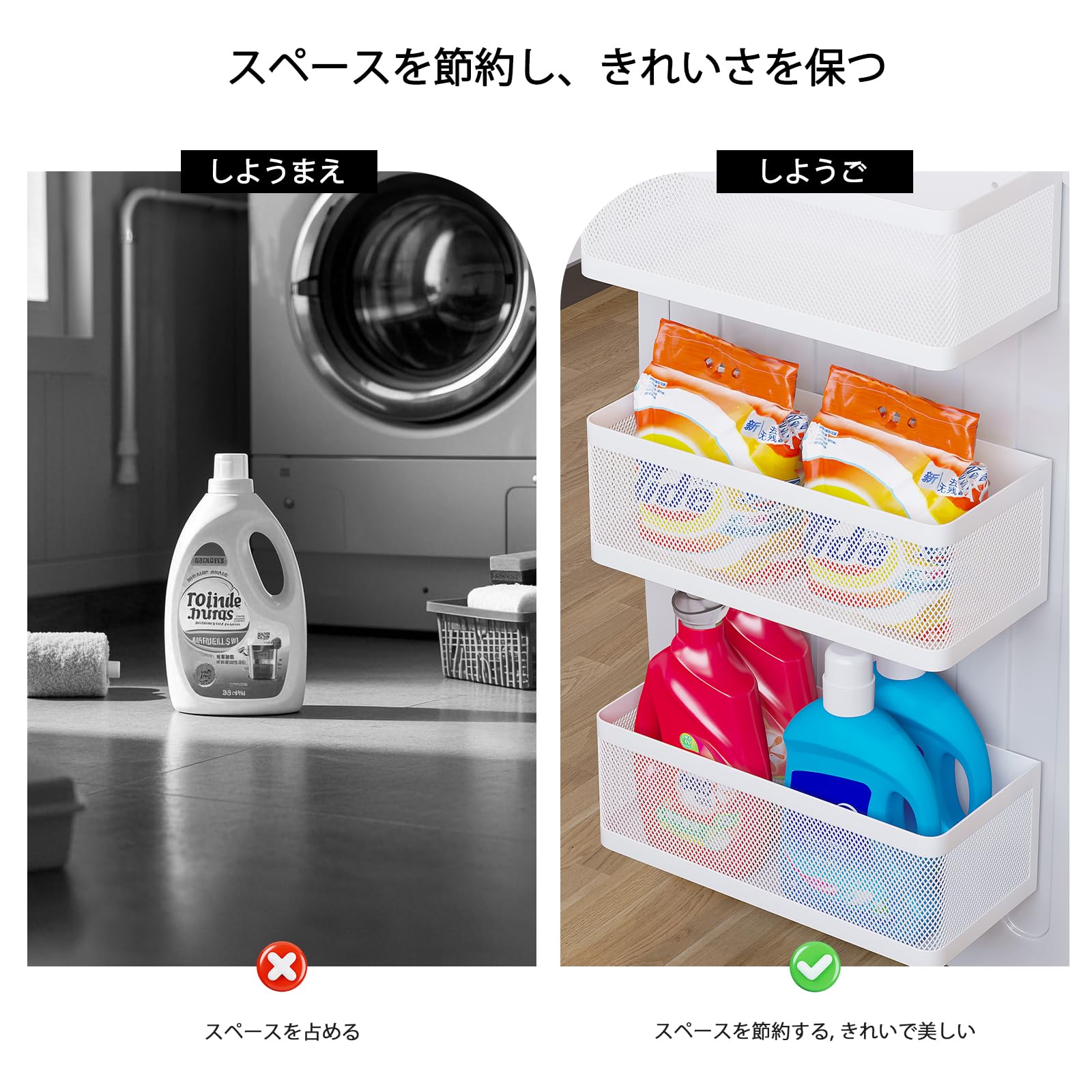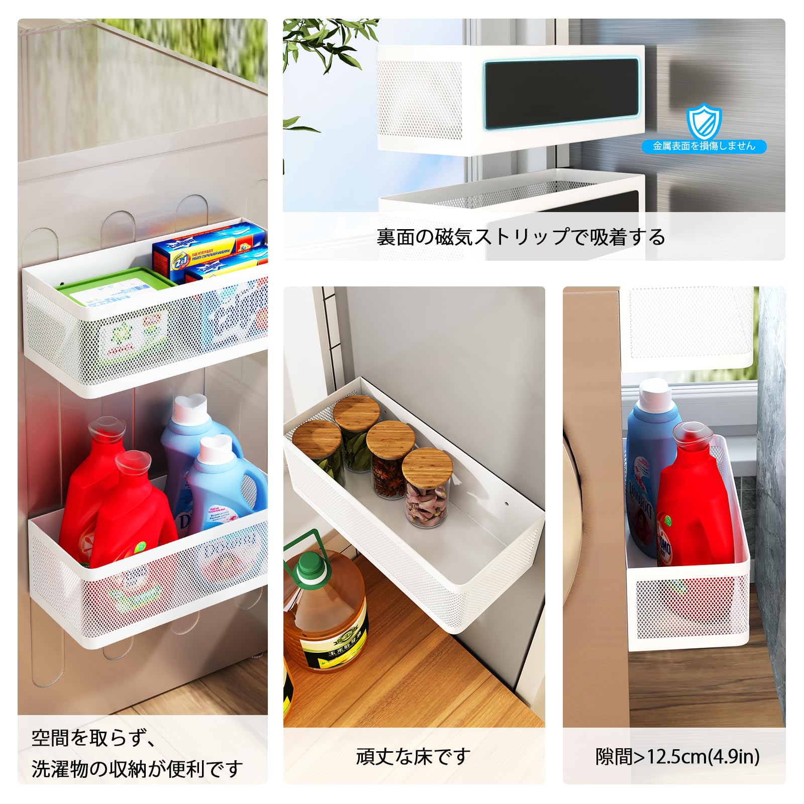 【多用途】洗濯機うえ収納としてだけでなく、冷蔵庫の調味料棚としても使用でき、調味料、油、ペーパータオル、その他の必需品を手の届くところに便利に保管できます。これにより、キッチンが整理整頓され、より多くの収納スペースが生まれます。また、かご収納は磁気本棚、磁気ロッカーオーガナイザー、磁気ドライヤーシートホルダーとしても使用できます。