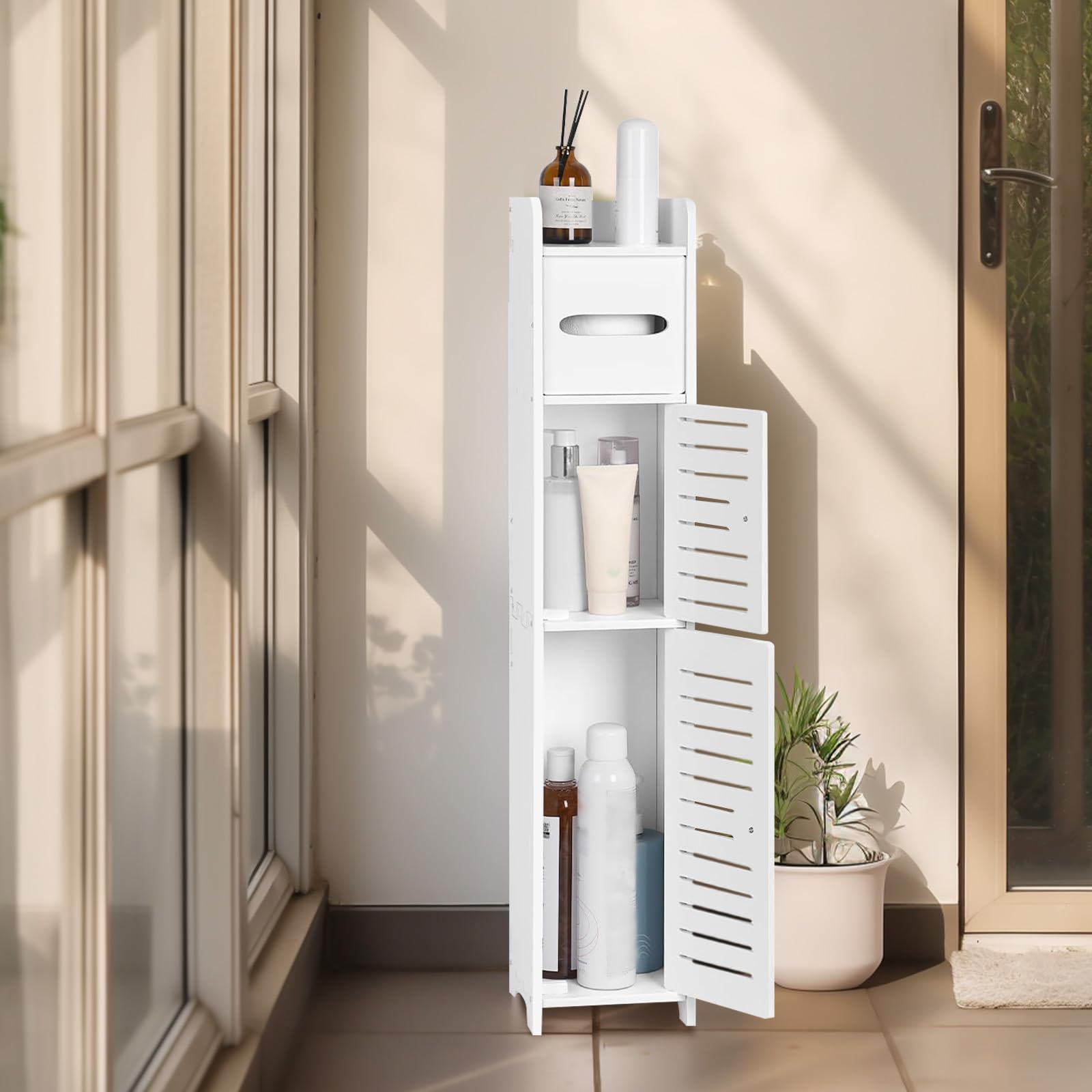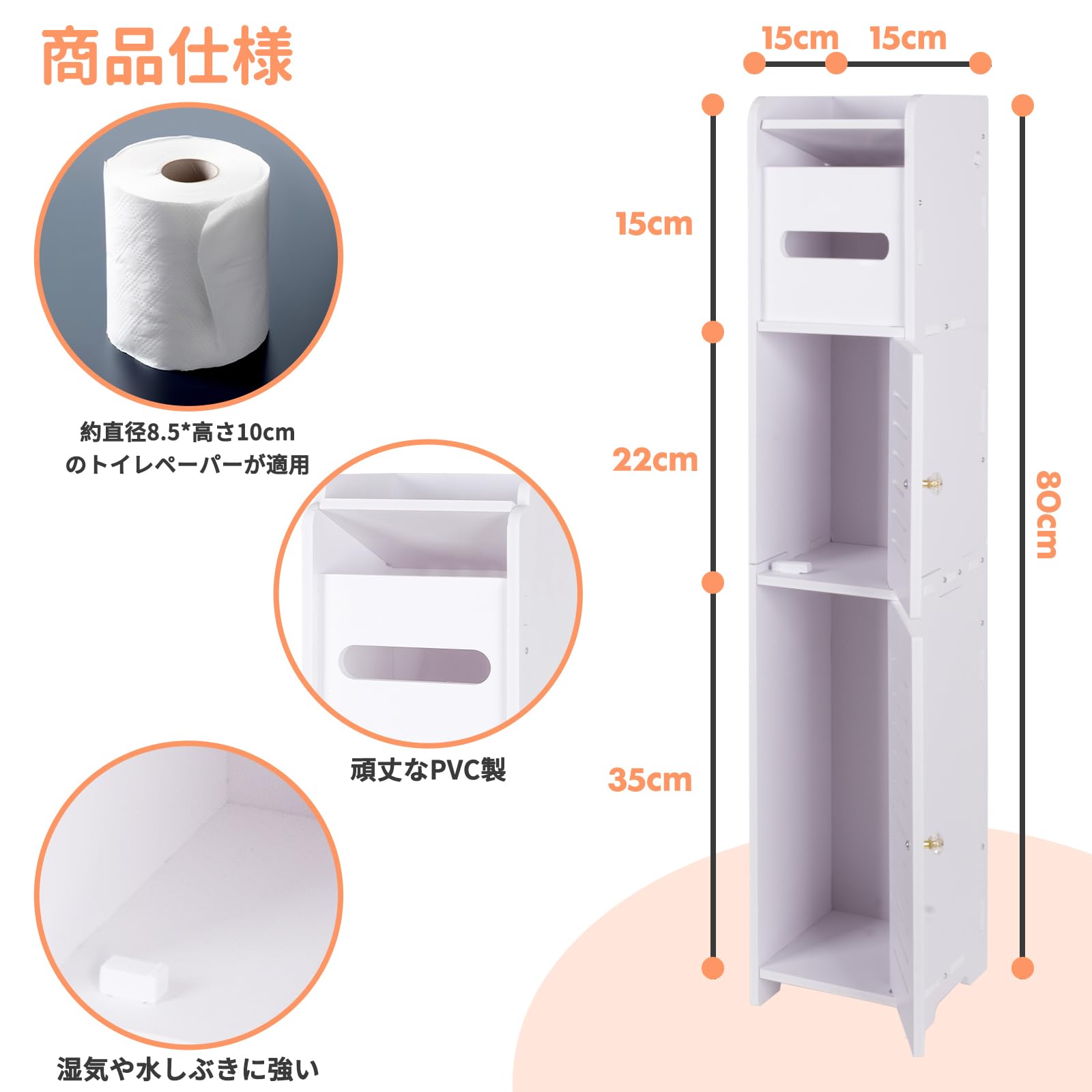【狭いトイレでも置けるサイズ】サイズは約幅15*奥行17*高さ80cmで、縦型のスリムな設計で邪魔にならないサイズ感、省スペースに収納空間を作るため、徹底的にスリムなデザインにこだわりました。清潔感のある白さがあり、スリムでシンプルなデザインなので、お部屋のどこに置いても馴染みます。