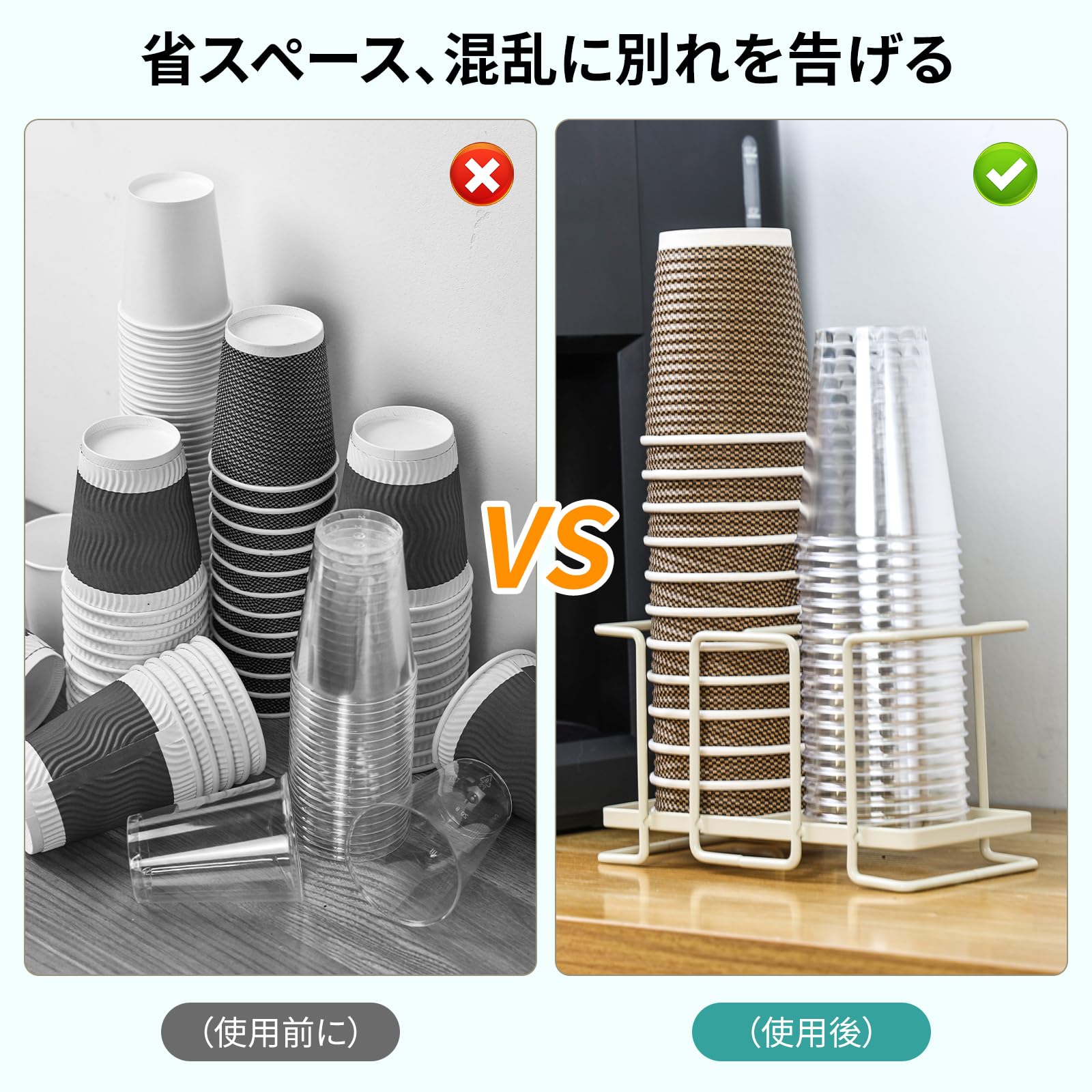 【大容量】直径8cm以下のカップに対応、使い捨ての紙カップやプラスチックカップもすっきり収納できます。縦型デザインなのでカップ数が一目瞭然で、詰め替えも簡単です。様々なカップに対応します。