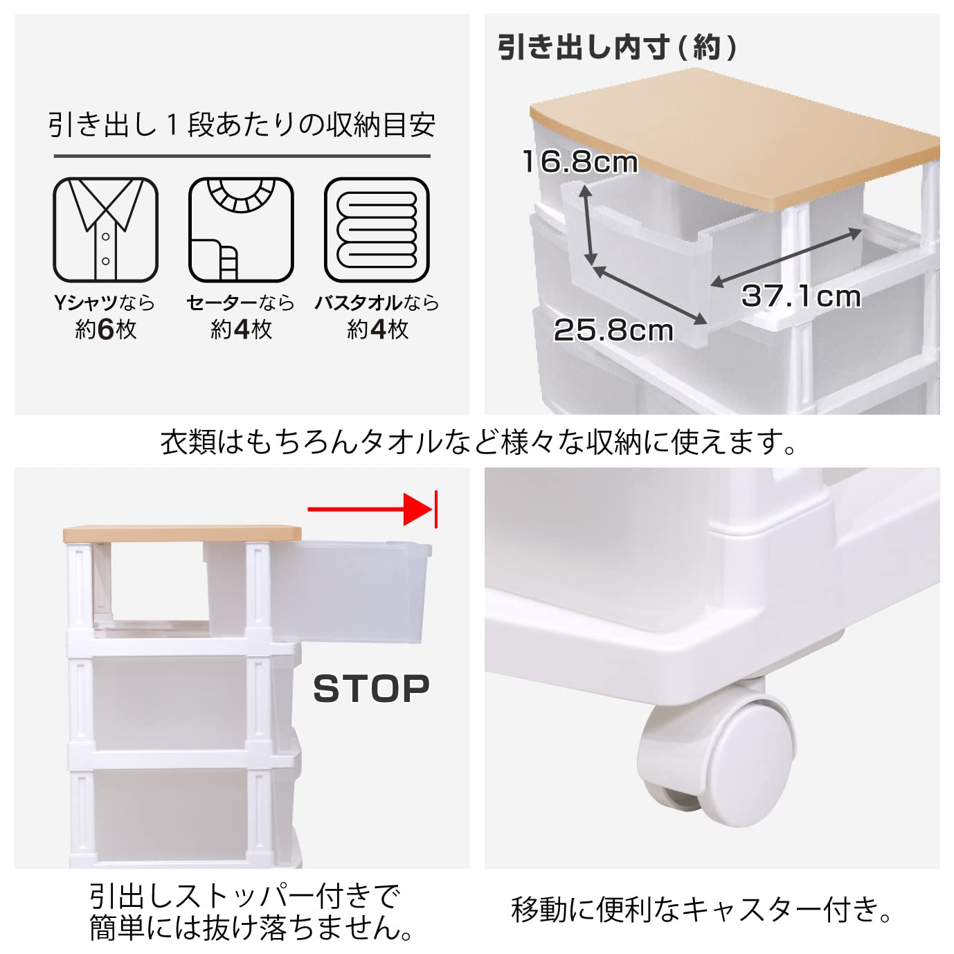 1段あたりの収納目安 Yシャツ4枚 セーター2枚 バスタオル4枚 二重構造と補強を施し耐荷重10kgを実現させたプラスチック製強化天版採用。 天板の表面はフルフラットにしている為、安定して物を置くことが出来ます。 また。プラスチック製なので汚れてもサッと拭けばすぐ取れて、いつでも清潔にお使い頂けます。 更に引出しはスリガラス調の半透明タイプでとっても素敵な商品に仕上がっています。 クローゼットや押入れの中での使用以外、リビングでも十分お使い頂けるフォルムとなっております。