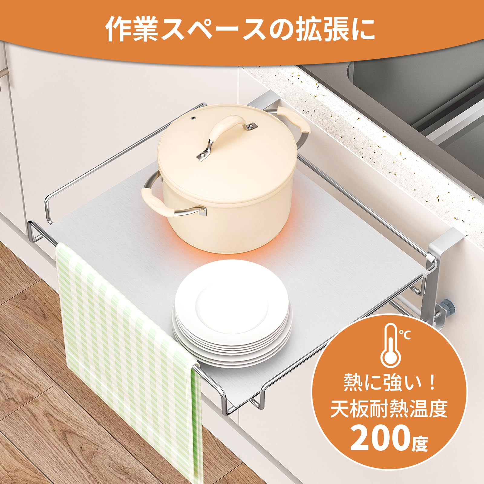 キッチンや台所で折り畳み作業台、補助テーブル、ちょっとした作業スペースとして、料理の材料を置いたり、鍋を置いたり、タオル掛け、ふきん掛けとしてご使用頂けます。