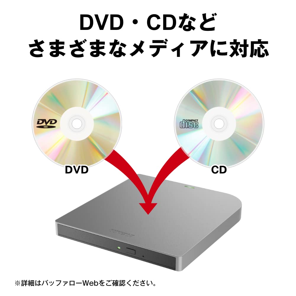 バッファロー USB3.2(Gen1)/3.0 外付け Mac 対応 DVD/CDドライブ バスパワー(給電ケーブル付き) 薄型ポータブル 国内 グレイ DVSM-PMV8U3-GY/N