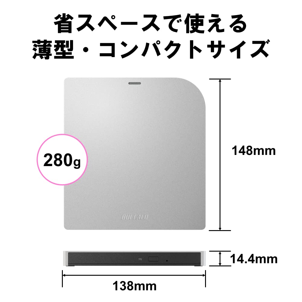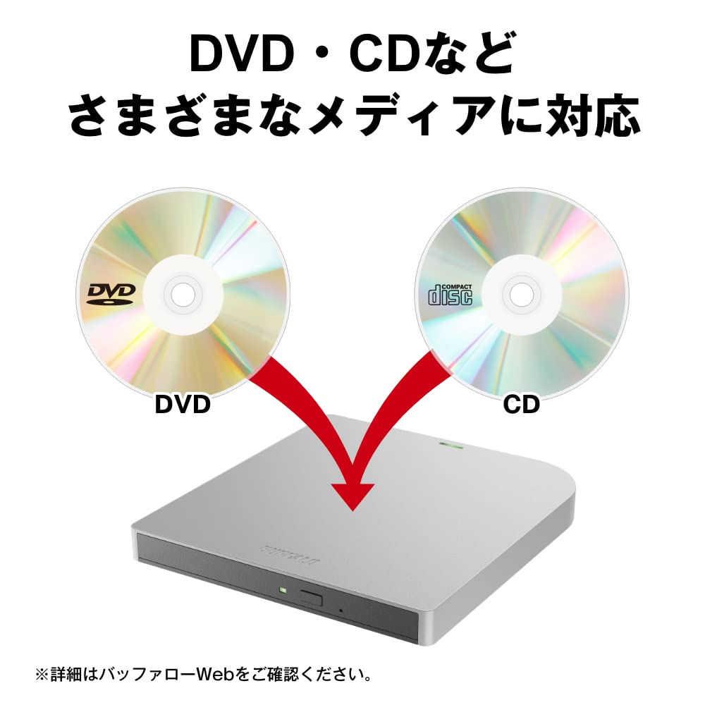 【数量限】バッファロー USB3.2(Gen1)/3.0 外付け Mac 対応 DVD/CDドライブ バスパワー(給電ケーブル付き) 薄型ポータブル 国内 シルバー DVSM-PMV8U3-SV/N