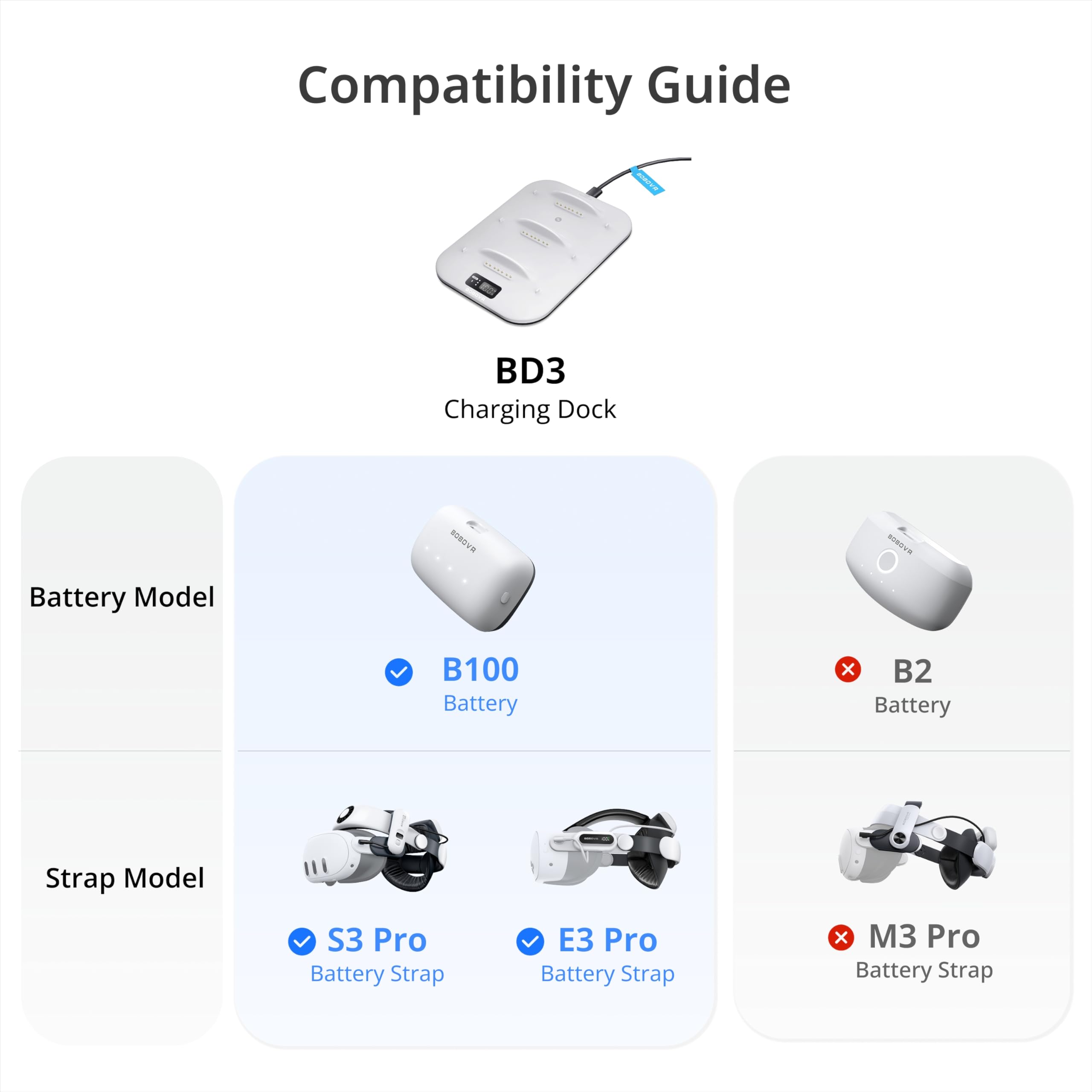 - BD3充電ステーションはB2バッテリーパック(M3 Proヘッドストラップ)の充電には対応しておらず、B100バッテリーパック(S3 Pro/E3 Proヘッドストラップ)のみに対応しています。 ご購入前にご注意ください。