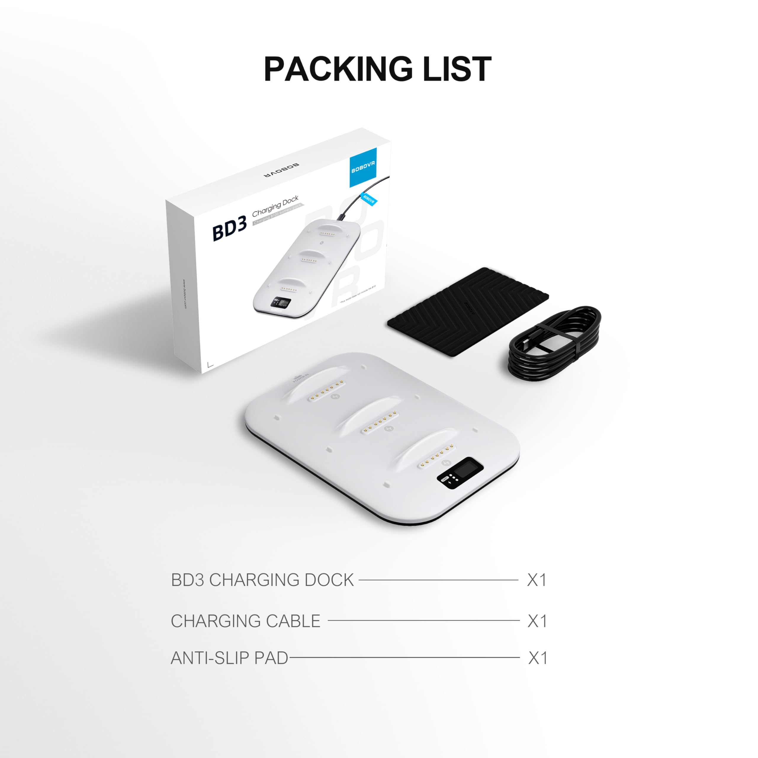 - BD3スーパー充電ドックは、BOBOVRがB100バッテリー専用に導入した追加の充電コンポーネントです。 デスクトップスタイルのシンプルなデザインで、B100バッテリー3本同時充電が可能です。