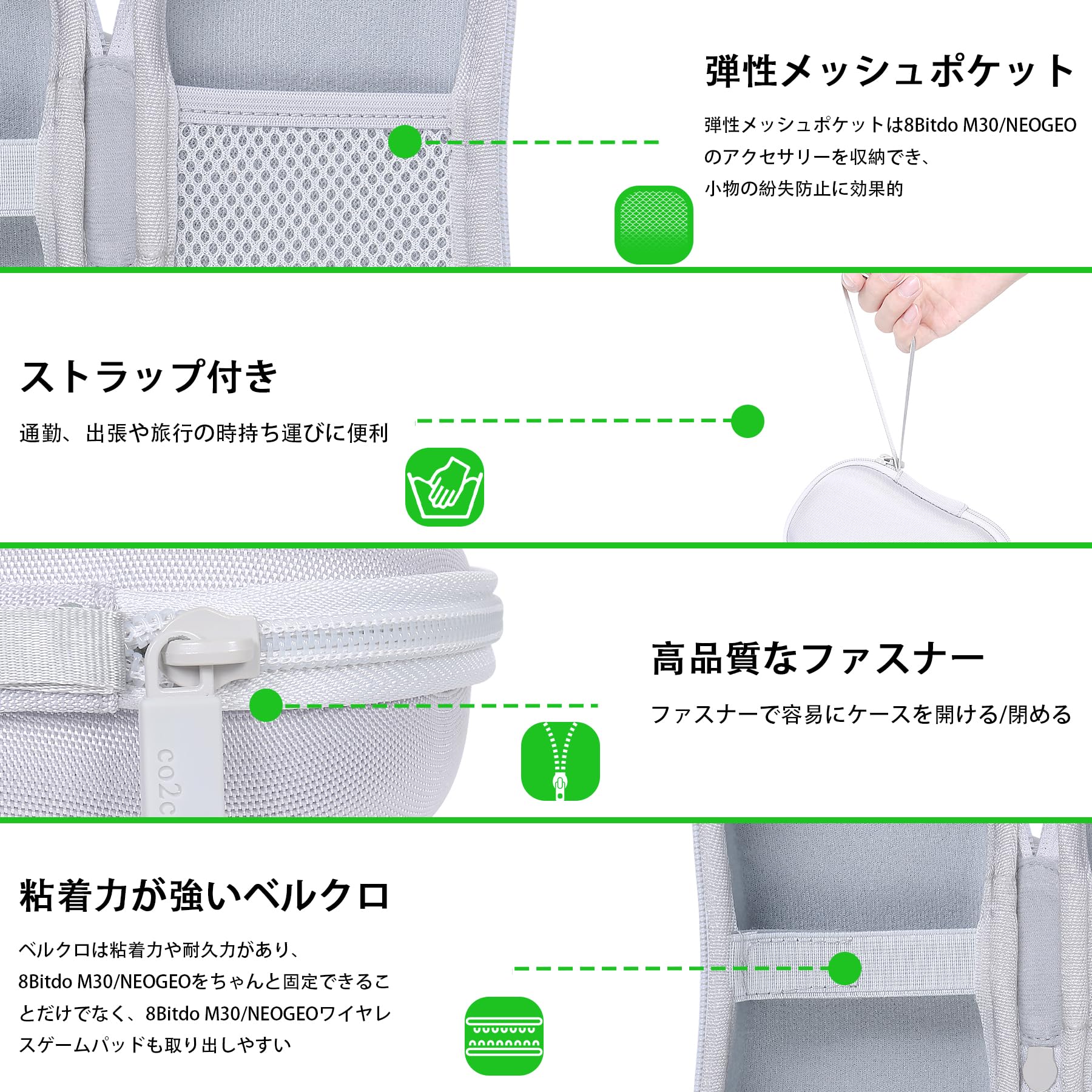【弾性メッシュポケット】弾性メッシュポケットは、8Bitdo M30/NEOGEOのアクセサリー を収納できます。そして下の固定用バンドは、8Bitdo M30/NEOGEOをちゃんと固定したりすることができます。ご注意:ケースのみの販売(8Bitdo M30/NEOGEOやアクセサリなどを含まれていません)