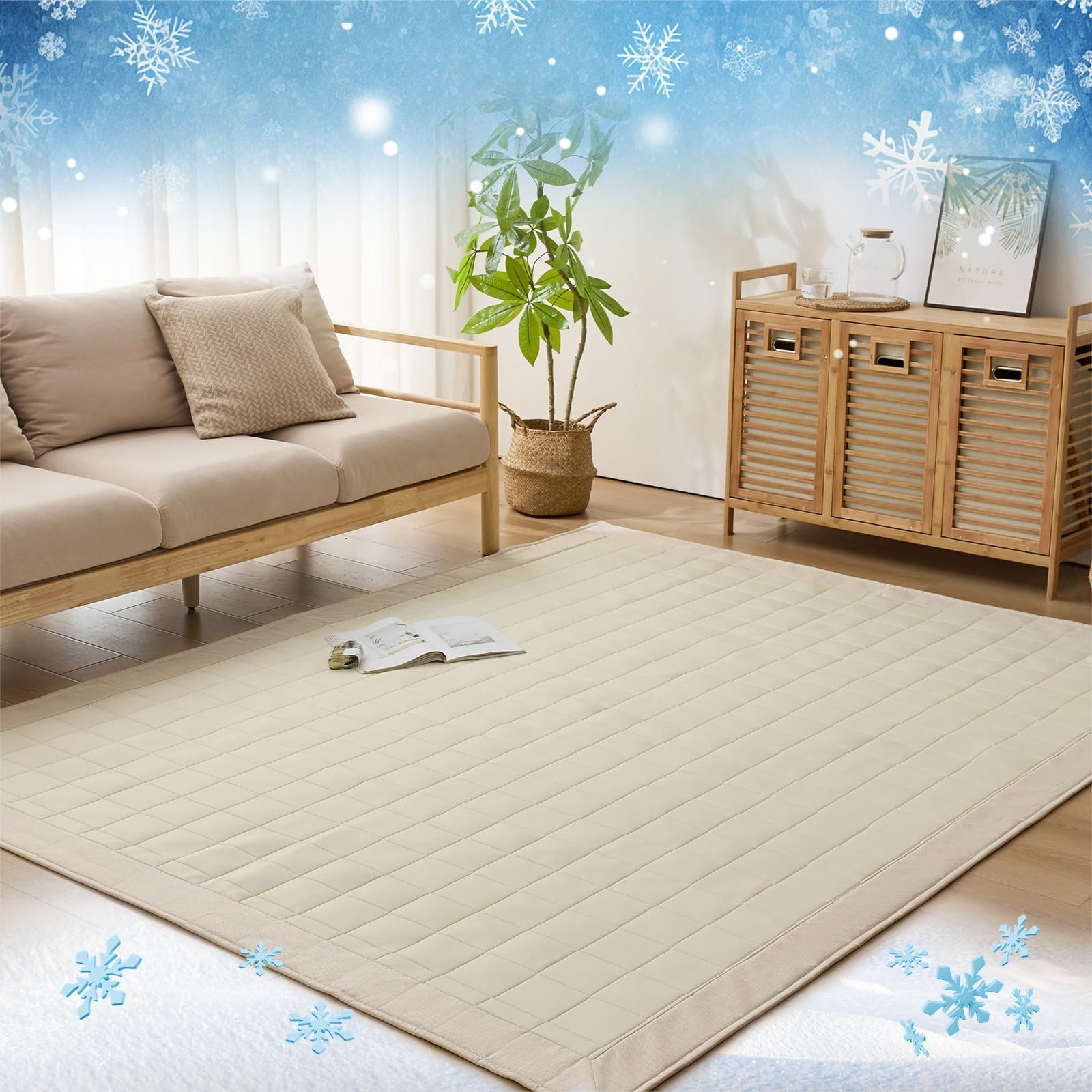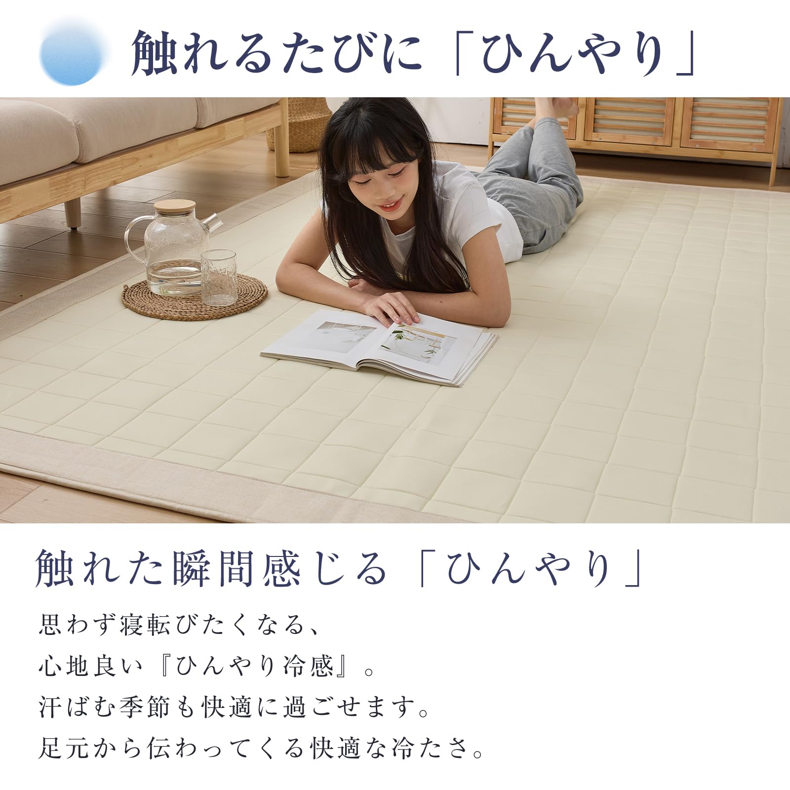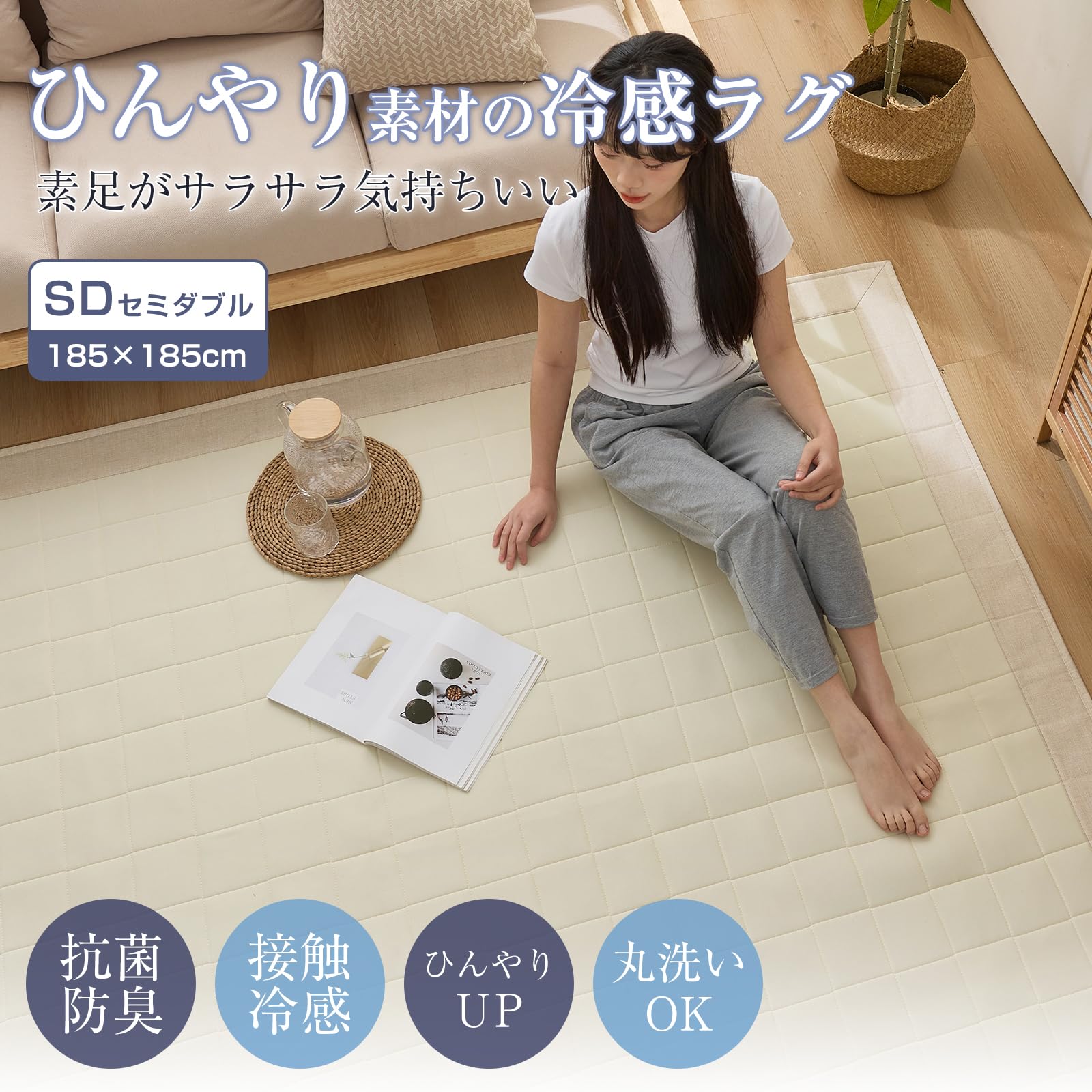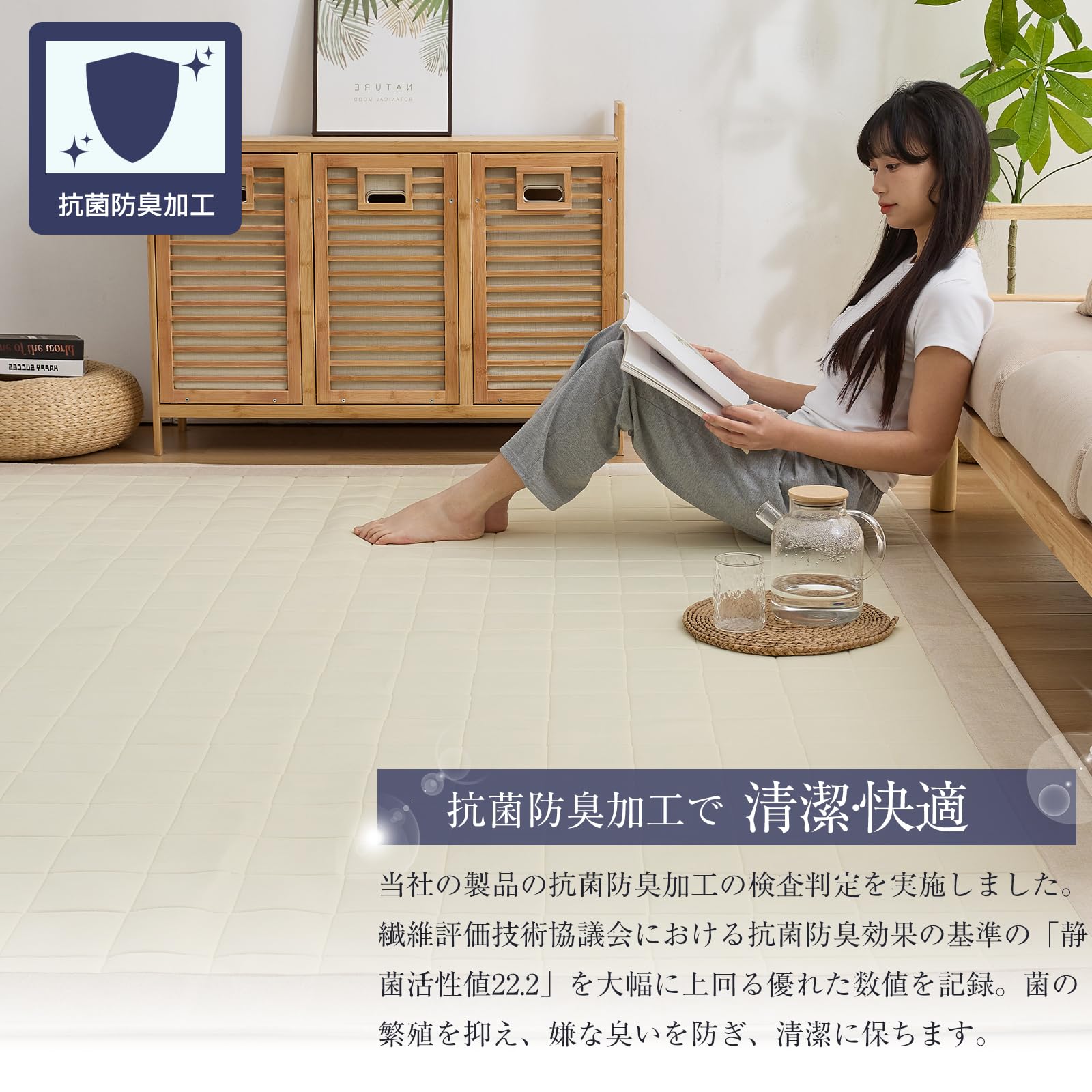 【通気性抜群・抗菌防臭防ダニ】当店の冷感ラグは吸水速乾機能で、熱気や湿気をしっかり吸収発散し、常に快適な状態をキープします。抗菌・消臭機能を持つ光触媒加工を採用し、細菌やダニを効果的に抑制します。さらに、光の力で有害物質やニオイ成分を分解し、いつでも清潔に使えます。