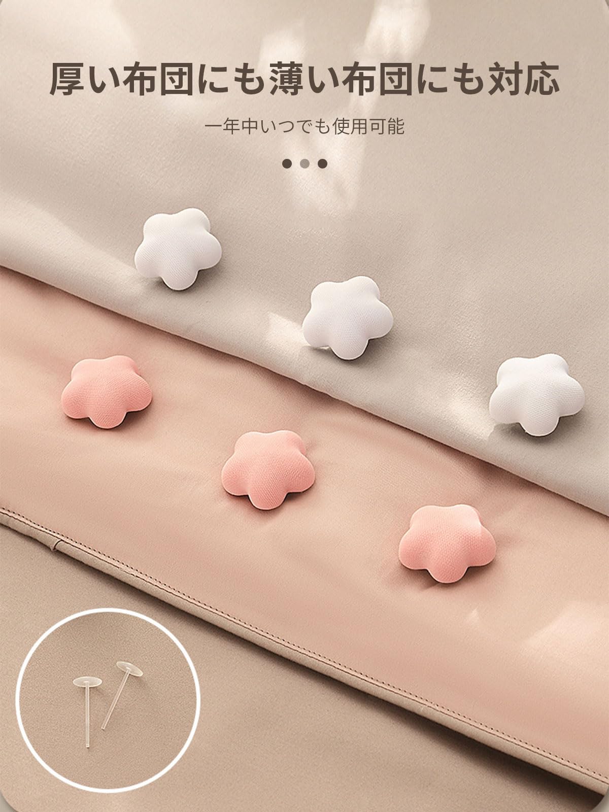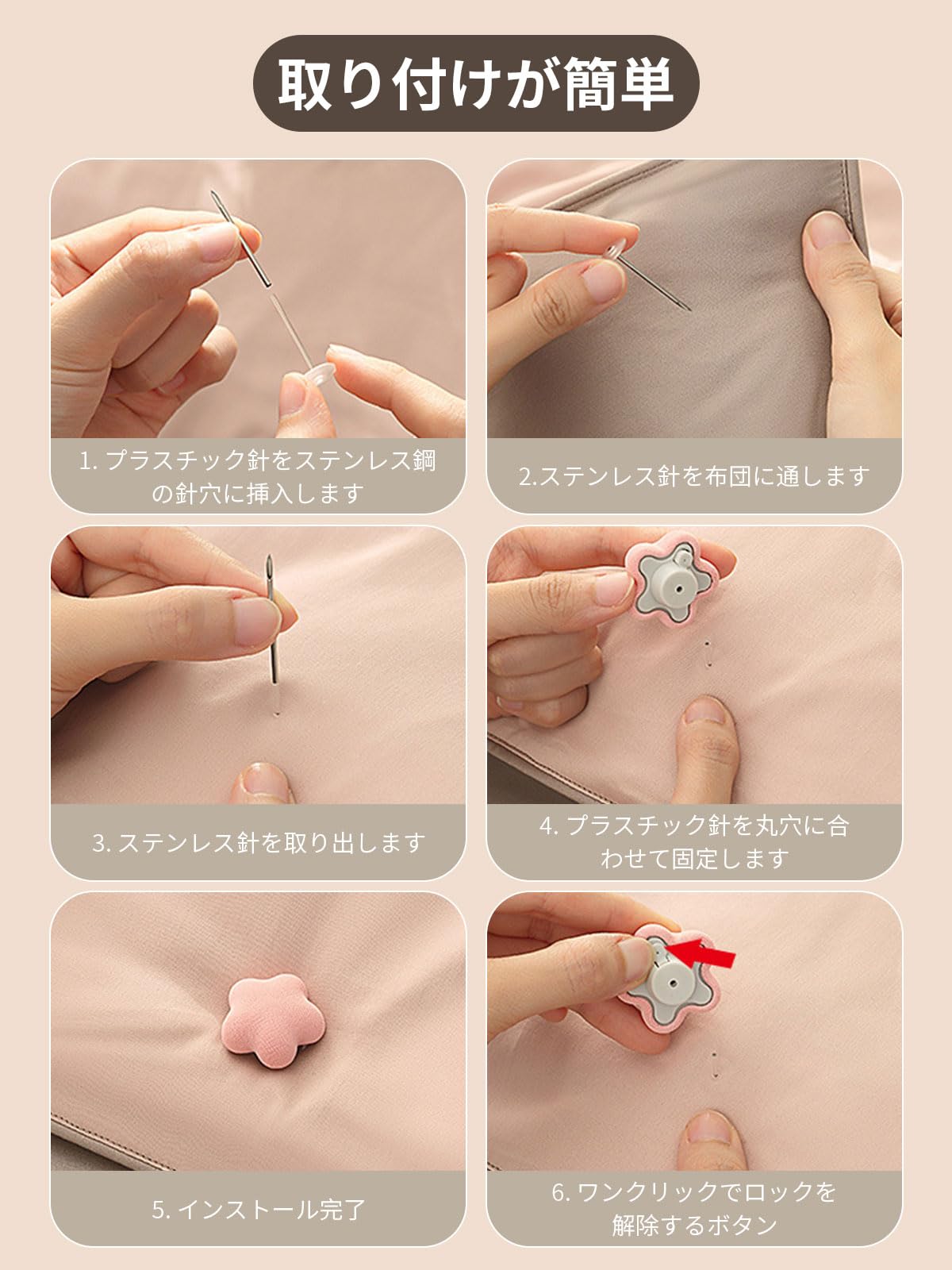 【操作簡単】プラスチック針をステンレス鋼の針穴に挿入します。ステンレス針を布団に通し、それを取り外します。プラスチック針を丸穴に合わせて固定します。 使用と設置が簡単で、季節を問わず使用できます。※より具体的な操作手順については、リンク内のビデオをご覧ください