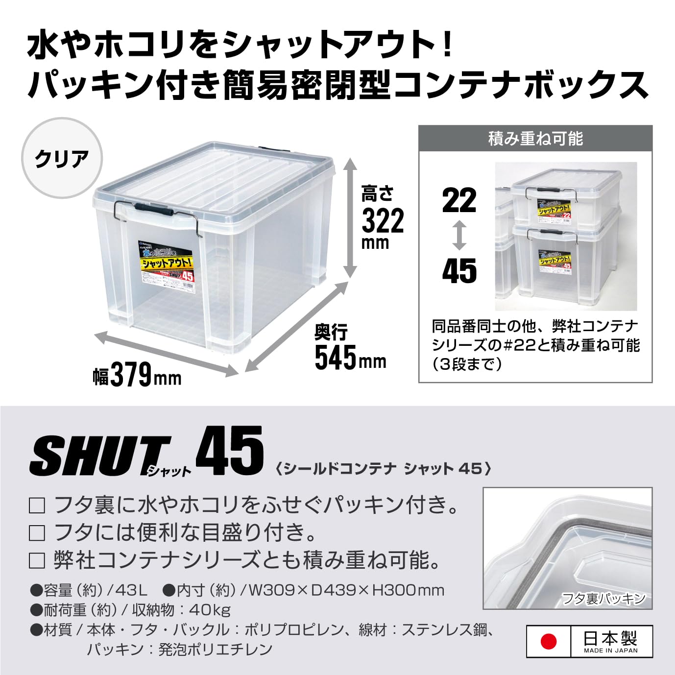 【新着】JEJアステージ 収納ボックス 日本製 パッキン付き 簡易密閉型 コンテナ 積み重ね [シールドコンテナシャット #45] 防災 幅38×奥行54.5×高さ32cm