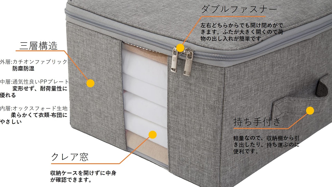 【折り畳み&窓付き】 折りたたみ式なので簡単に組み立てが出来ます。使わない時には折り畳んでコンパクトに収納できます。両側に取っ手付きです。押し入れの中、クローゼットの上やベットの下にらくらく持ち運べます。収納ケースの側面に大きめな透明窓があり収納ケースを開けずに中身が確認できます。