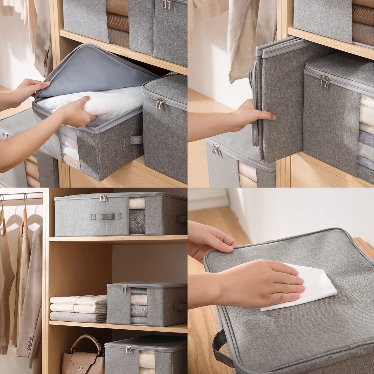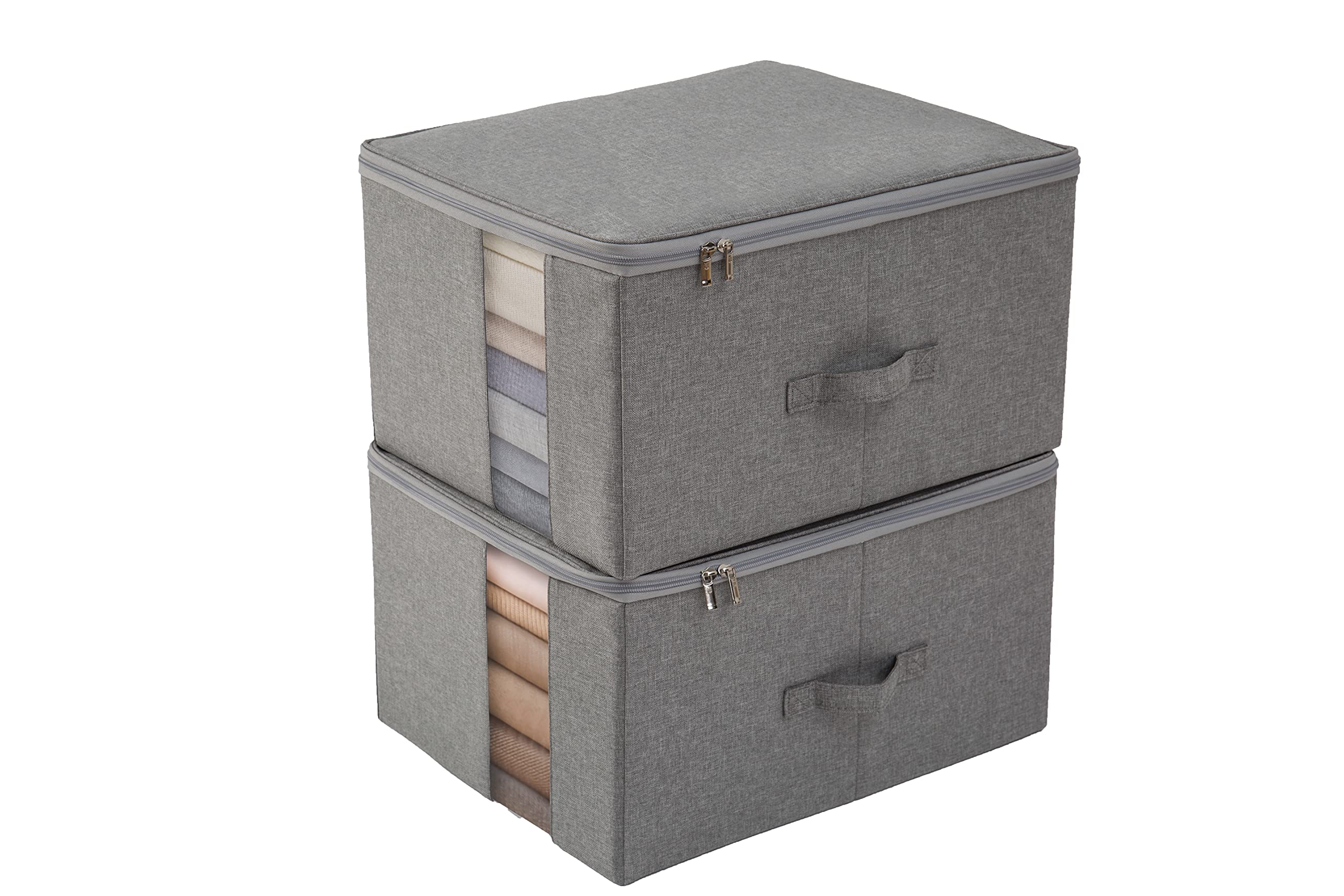 TIANZONG収納ボックス 収納ケース 大容量 衣類収納 折りたたみ 取っ手付き ふた付き おしゃれ 布製 衣装ケース 透明窓付き ファスナー (グレー, 幅45×奥行35×高さ25cm 2点セット)