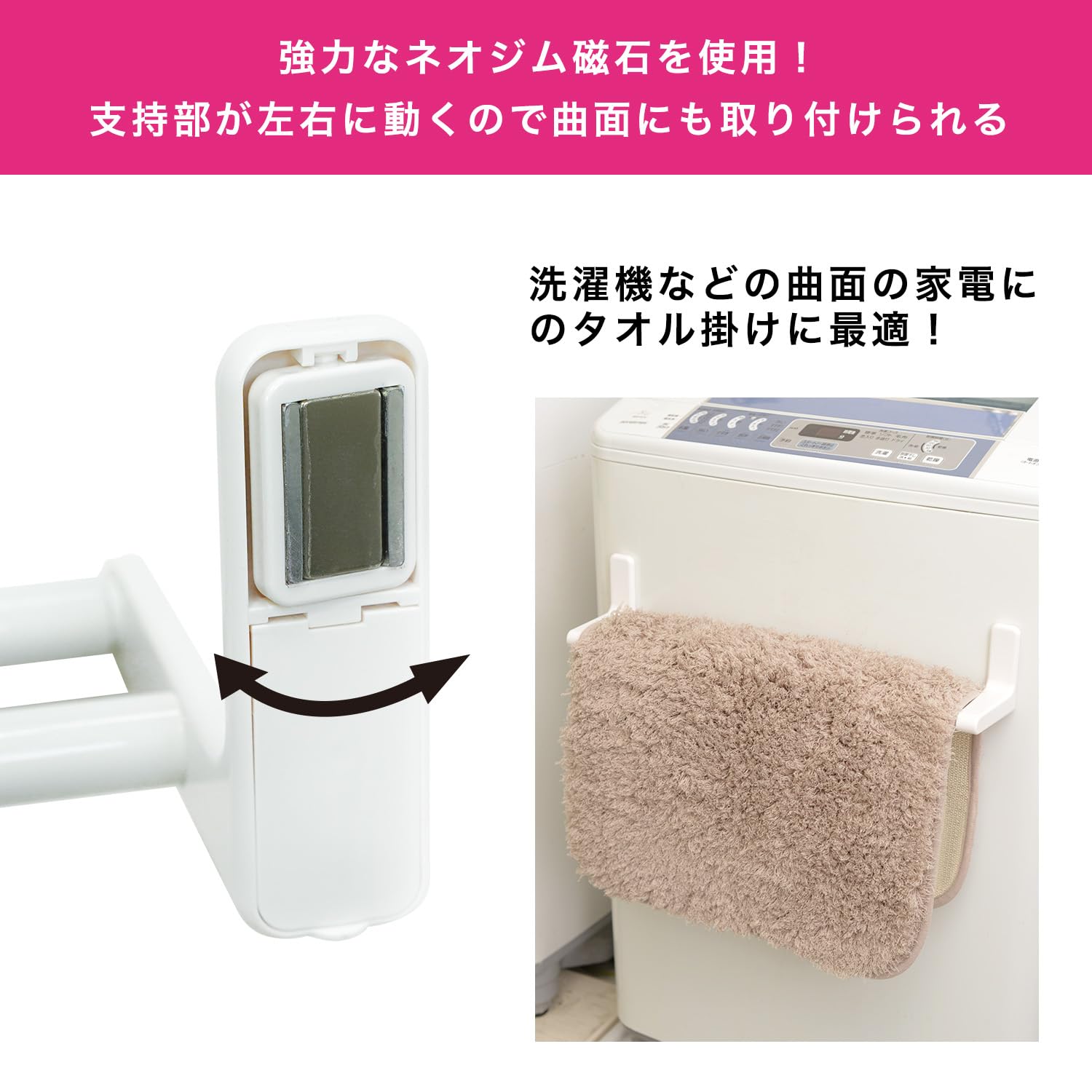 支持部が動くので洗濯機の曲面にも取り付け可能です。