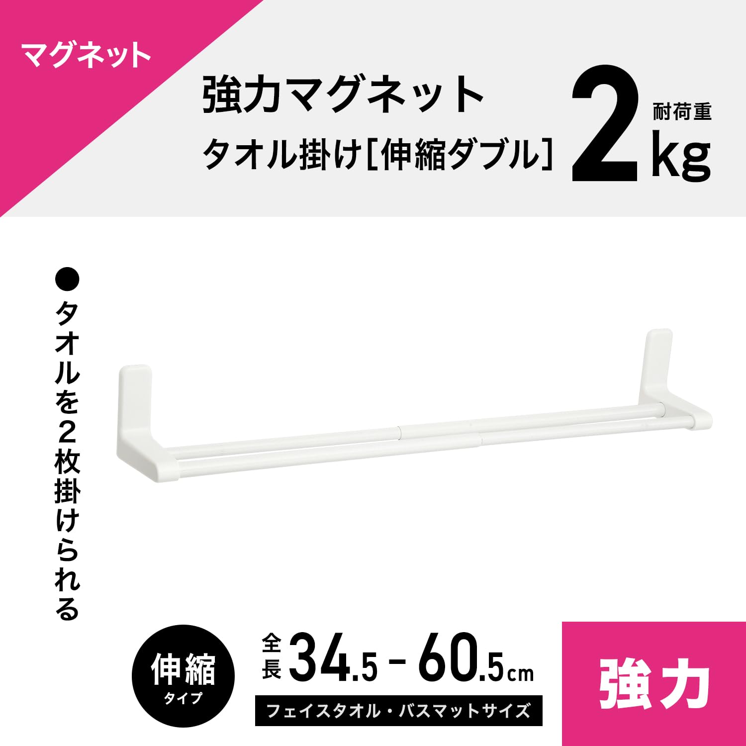 【新着】強力 マグネット 伸縮 タオル掛け 伸縮幅 34.5〜60.5cm(干幅29〜54.5cm) 耐荷重2kg 曲面取付け対応 キズ防止シート付き