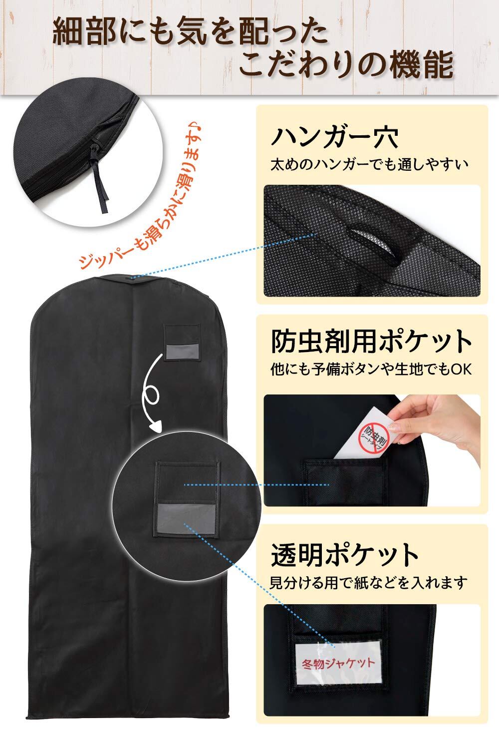 【実用的ポケット付き】胸元に2つのポケットがあります。深めポケットに、防虫剤やムシューダ、ボタン、余り生地などを収納することができます。メモ用ポケットは透明になっているため、収納した衣類についてのメモ書きを入れるのがおすすめです。※記載例としては、”ママ用コート”、”パパ用タキシード”等の書き方もできますし、ご自身だけのクローゼットに収納する場合は、ブランド名や品名などご記載いただくことで判別しやすくなります。