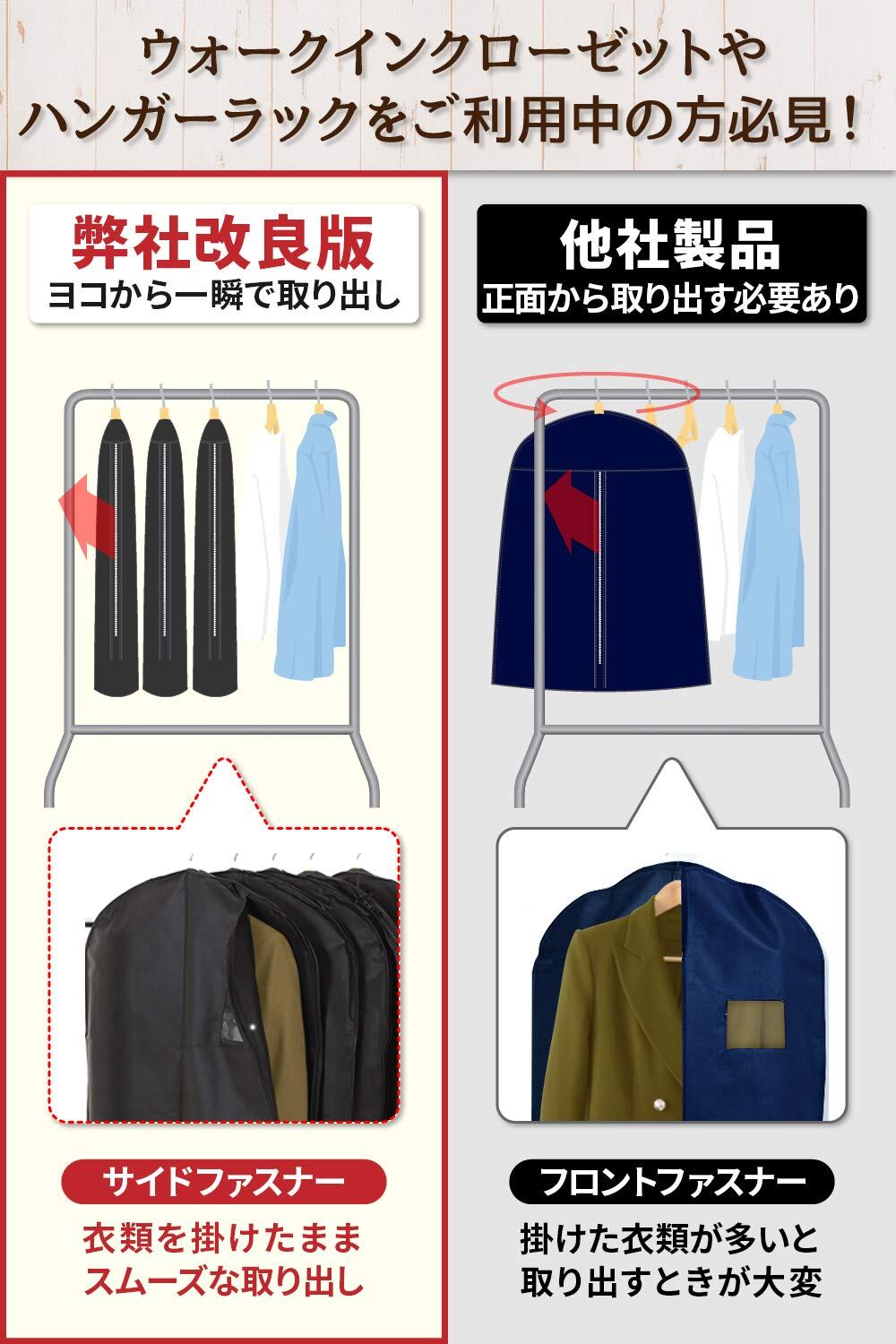【使い勝手◎な横開けタイプ】クローゼットやハンガーラックに衣類を掛ける場合、正面のファスナーでは使いづらい。そんな悩みを解決しました。クローゼットから引っ張り出さなくても、サッと衣類のみを取り出せる構造になっています。洋服カバーのファスナーを横に取り付けた”サイドファスナー”タイプです。洋服でいっぱいのクローゼットの中であってもラクラク出し入れが可能です。