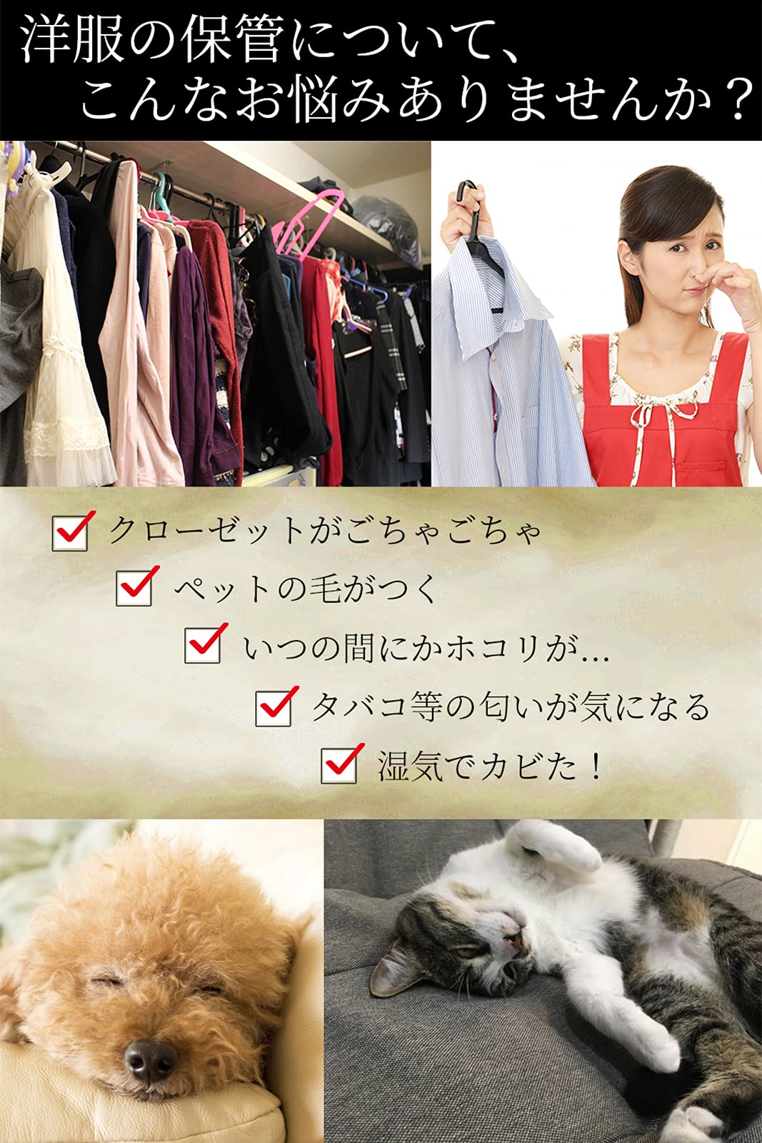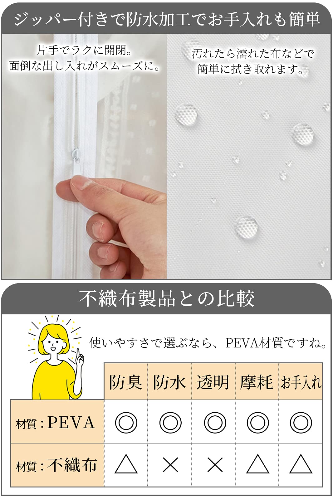 【■防水性が抜群】 水に強いPEVA材質。湿気から服を守り、カビ・ニオイ・虫を防ぎます。汚れたら水拭き可能。タバコのニオイ・生活臭・虫食いから衣類を守って長持ちさせます。