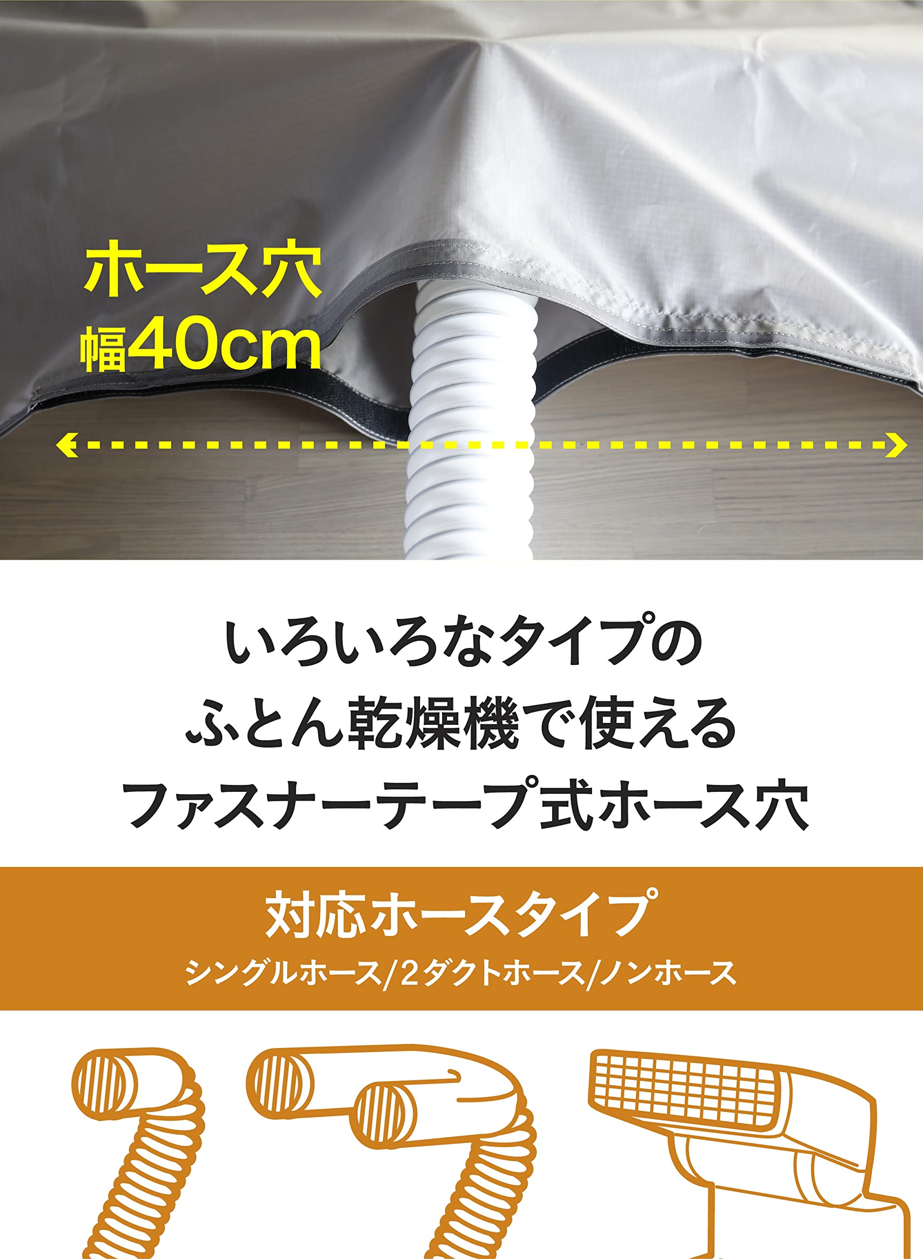 ホース穴は様々な形のホースに対応できるファスナーテープ仕様なので、お手持ちのふとん乾燥機ですぐに使えます。※対応ホースタイプ:シングルホース/2ダクトホース/ノンホース