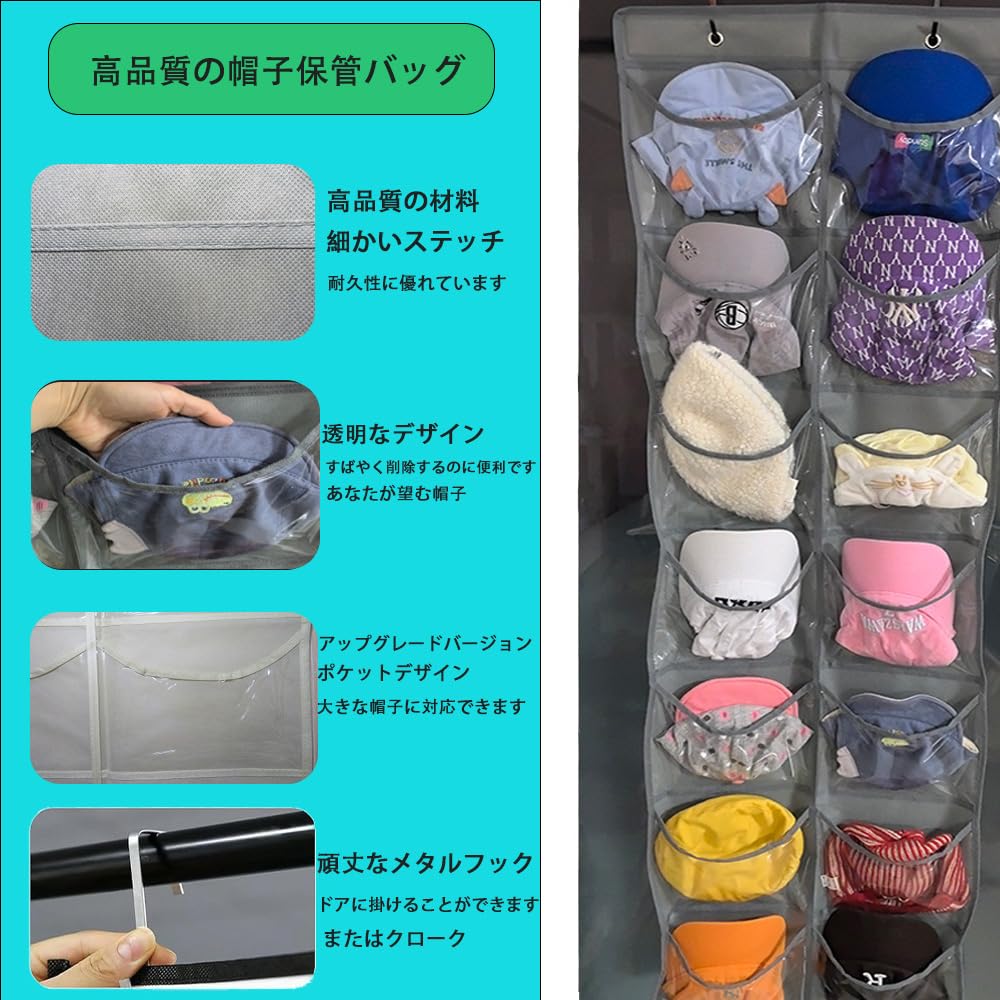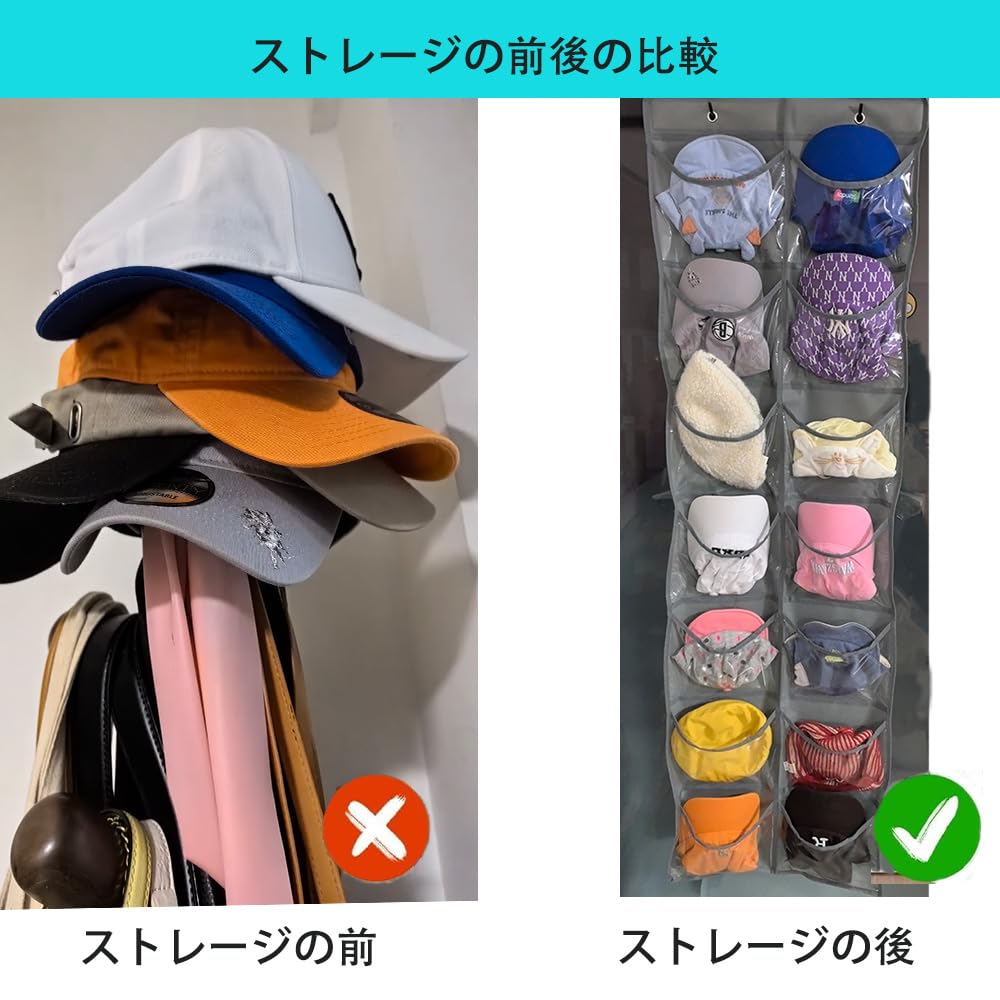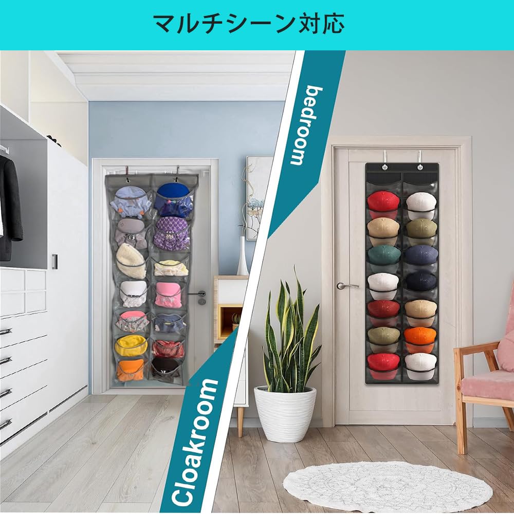 アップグレードされた野球帽ラック:クローゼット用の帽子オーガナイザーは、野球帽の保管と取り出しが簡単になったルーズポケットをアップグレードしました。丈夫なポリエステル繊維素材と細かい縫製により、耐久性に優れています。調節可能なフックは、さまざまな厚さのドアに適しています