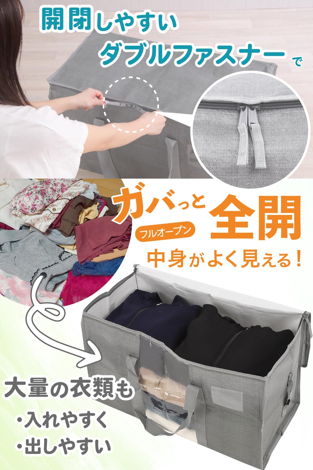 【多目的活用&長期使用対応】 引越し時の荷物整理、衣替えでの冬物夏物管理、布団収納、アウトドア用品保管、子供部屋のおもちゃ収納まで多目的に対応。ダブルファスナーで全開、肩掛け背負い2WAY、横持ち手付きで持ち運び方法を選択可能。折りたたみ収納でコンパクト保管、繰り返し使用でエコ、段ボール不要で組み立て手間なし、ゴミ出し不要の環境配慮設計です。