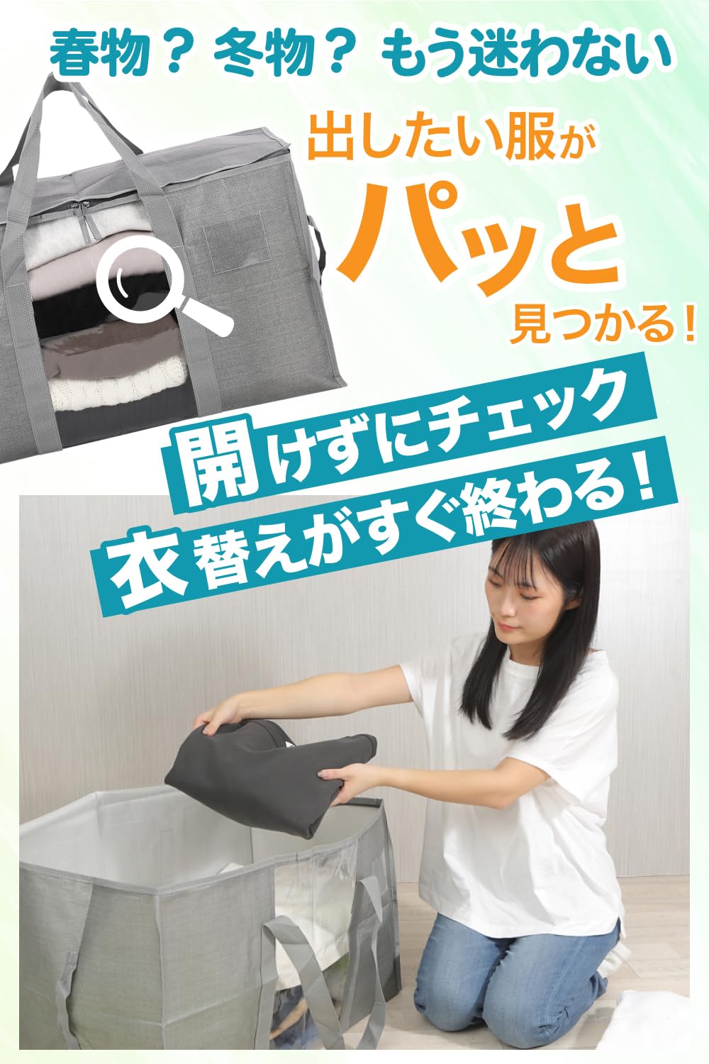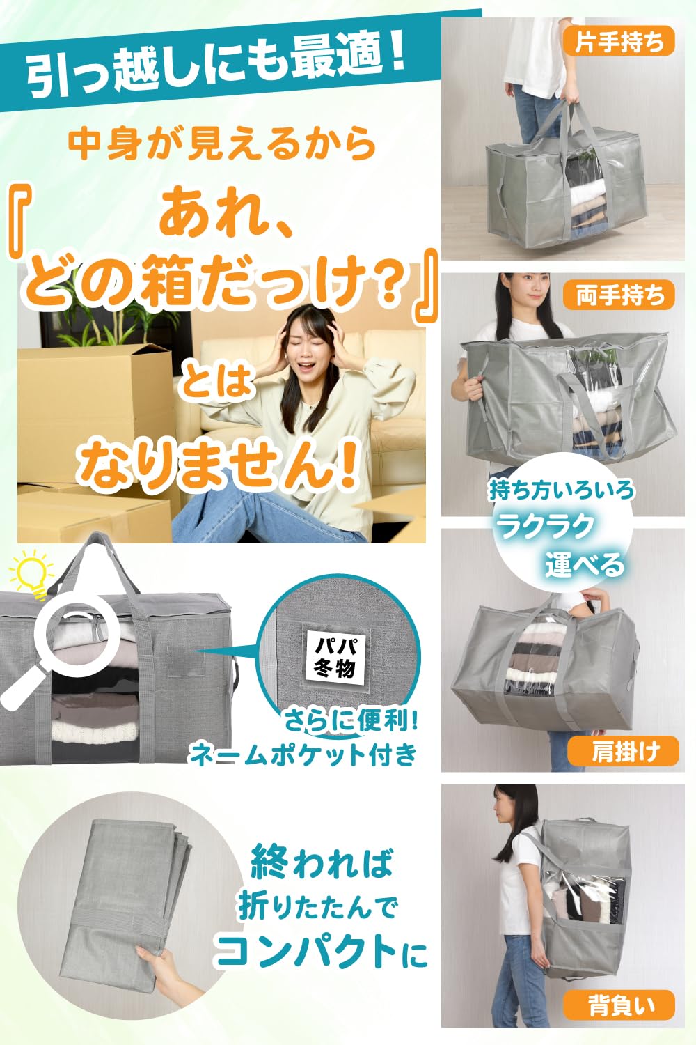 【透明窓で中身確認&探し物ゼロ】 透明窓付きで開けずに内容物をチェック可能。複数の収納バッグから目的のものを瞬時に発見でき、記憶やメモは不要です。シーズン衣類の管理、引越し荷物の整理、防災備蓄品の確認、布団や毛布の種類判別がスムーズに行えます。子供や高齢者でも目的のバッグを簡単に特定でき、家族全員が使いやすい設計となっています。