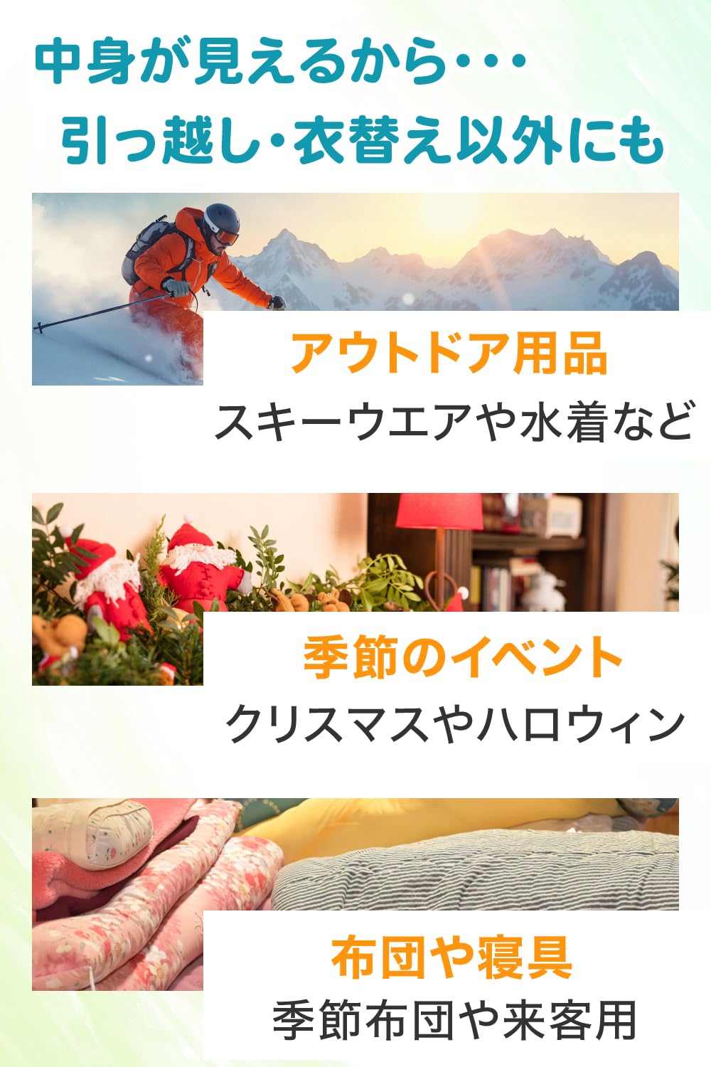 【収納管理の効率化&視覚的整理システム】 見える化により収納内容のインベントリ管理が容易になり、仕分けミスを防止します。衣類や布団の湿気・カビ状態を外から確認でき、定期的なメンテナンスも開封不要で実施可能。ウォークインクローゼットでの衣類選び、キャンプ用品の種類別収納、ハンドメイド作品や素材の保管管理など、カテゴリ別収納をスムーズに実現します。