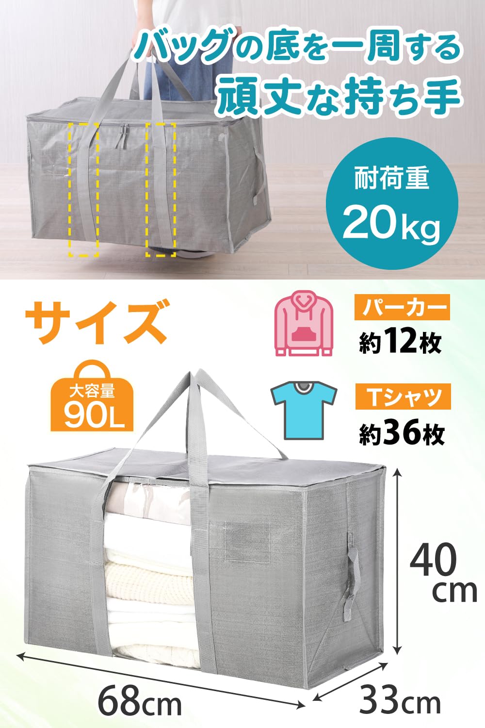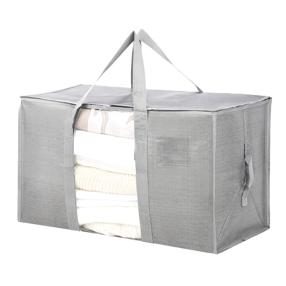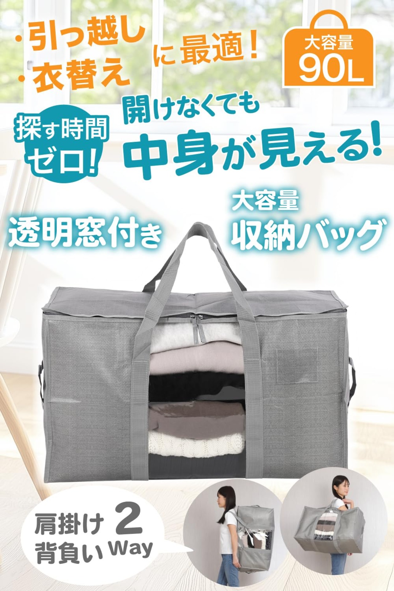 【人気】透明窓付き 衣類収納バッグ 布団収納 コインランドリー 袋 引越し 大きいバッグ ふとん 収納袋 ソフトコンテナ 収納ボックス 洋服収納 背負える 特大 折りたたみ 持ち運び 洗濯袋 透明窓 (68x40x33cm 90L 1 個) | GIGATERA