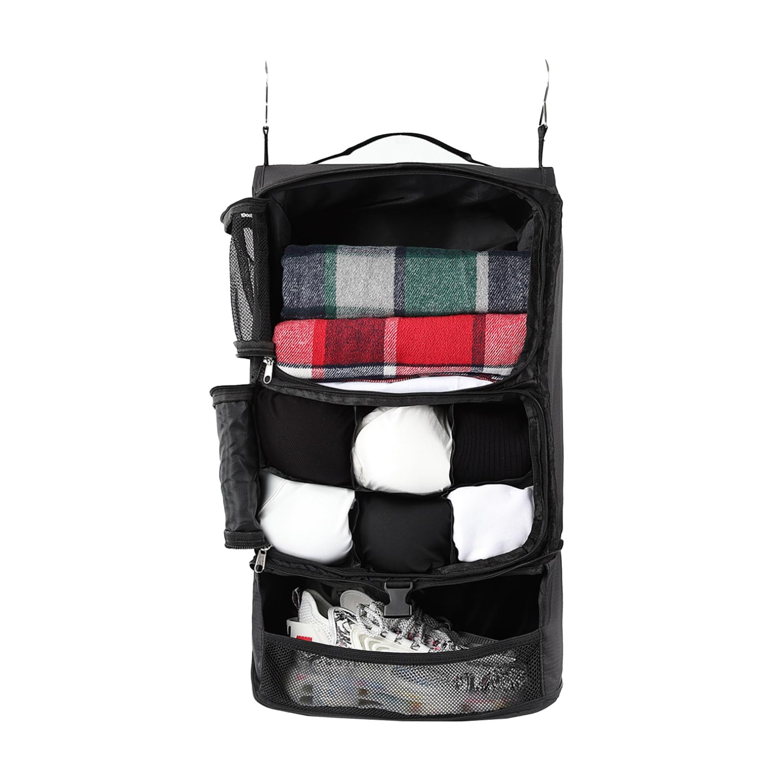 TABITORA(タビトラ) 吊り下げ収納バック 収納ボックス トラベルポーチ 旅行グッズ 圧縮ポーチ 吊り下げ トラベルクローゼット インナーバッグ 整理収納 分類 衣類 服 洋服入れ 持ち運べる クローゼット 大容量 3段 たびとり 旅トラ 旅行 出張 (BLACK, XL)