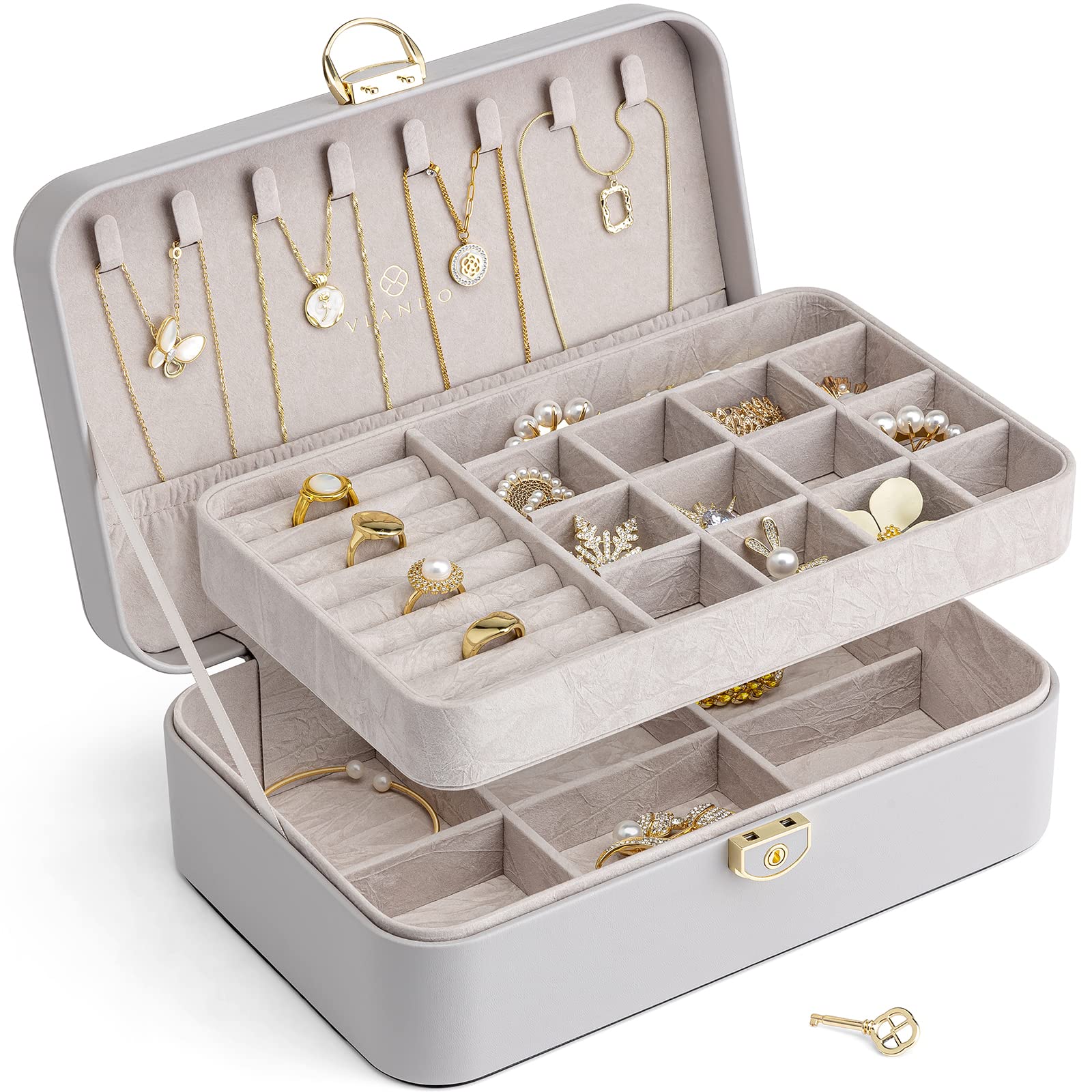 【?大容量収納】寸法16.5*8.2*25.4cmの大容量設計で、Vlando二段式ジュエリーボックスはネックレスは8本以上、リングは16個以上の収納が可能です。時計やブレスレット、ピアスなどの小物も自由に収めることができます。豊富な収納スペースにより、あなたのジュエリーコレクションを一箇所にまとめて整理できます。鍵付きの構造で大切な品々を守り、柔らかな人工皮革製の上品な外観はインテリアにもなじみます。洗練されたデザインと高品質な仕上がりで、ジュエリーコレクションの中心となる収納ボックスです。