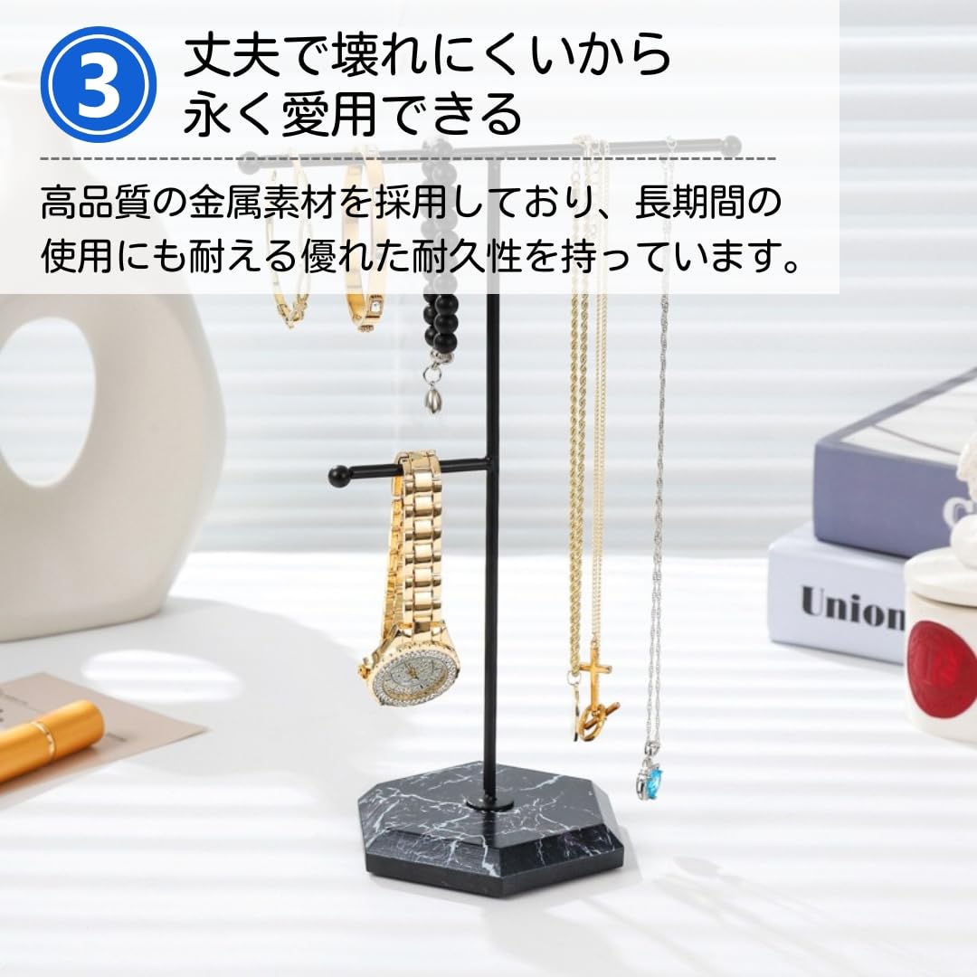 【高級感と安定性を兼ね備えた大理石ベース】ベースは大理石のデザインで美しく、安定性があるためジュエリーの重さで倒れることはありません。