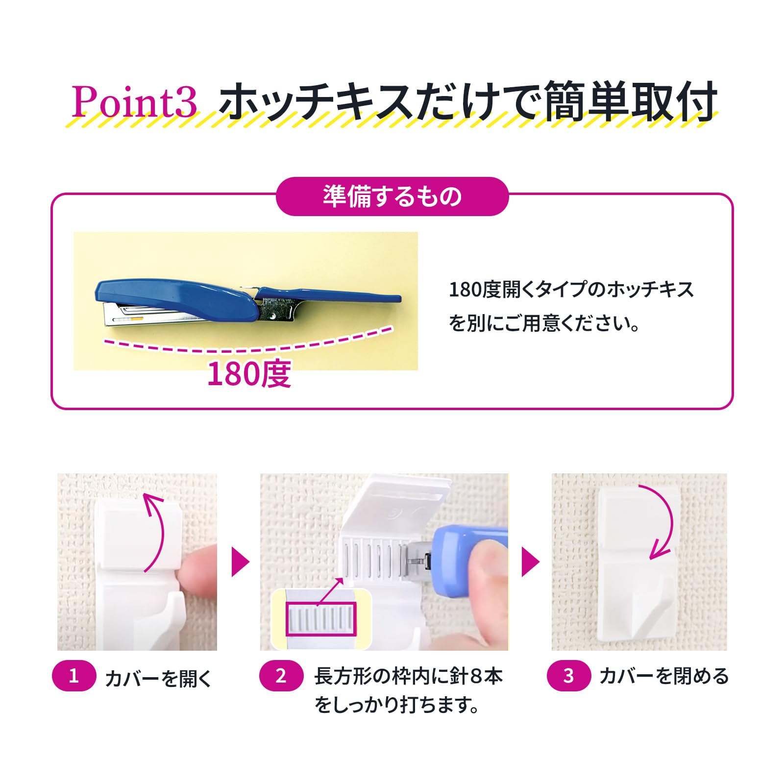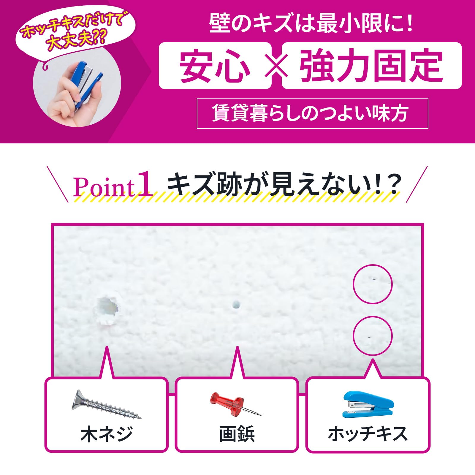 キズ跡が見えない! ?キズが超小さい壁掛けフック。ホッチキスで簡単取付。 穴のサイズは虫ピン、画鋲の穴の10分の1以下! 。だからフックを外してもキズが超小さい! !傷が小さいから賃貸でも安心。
