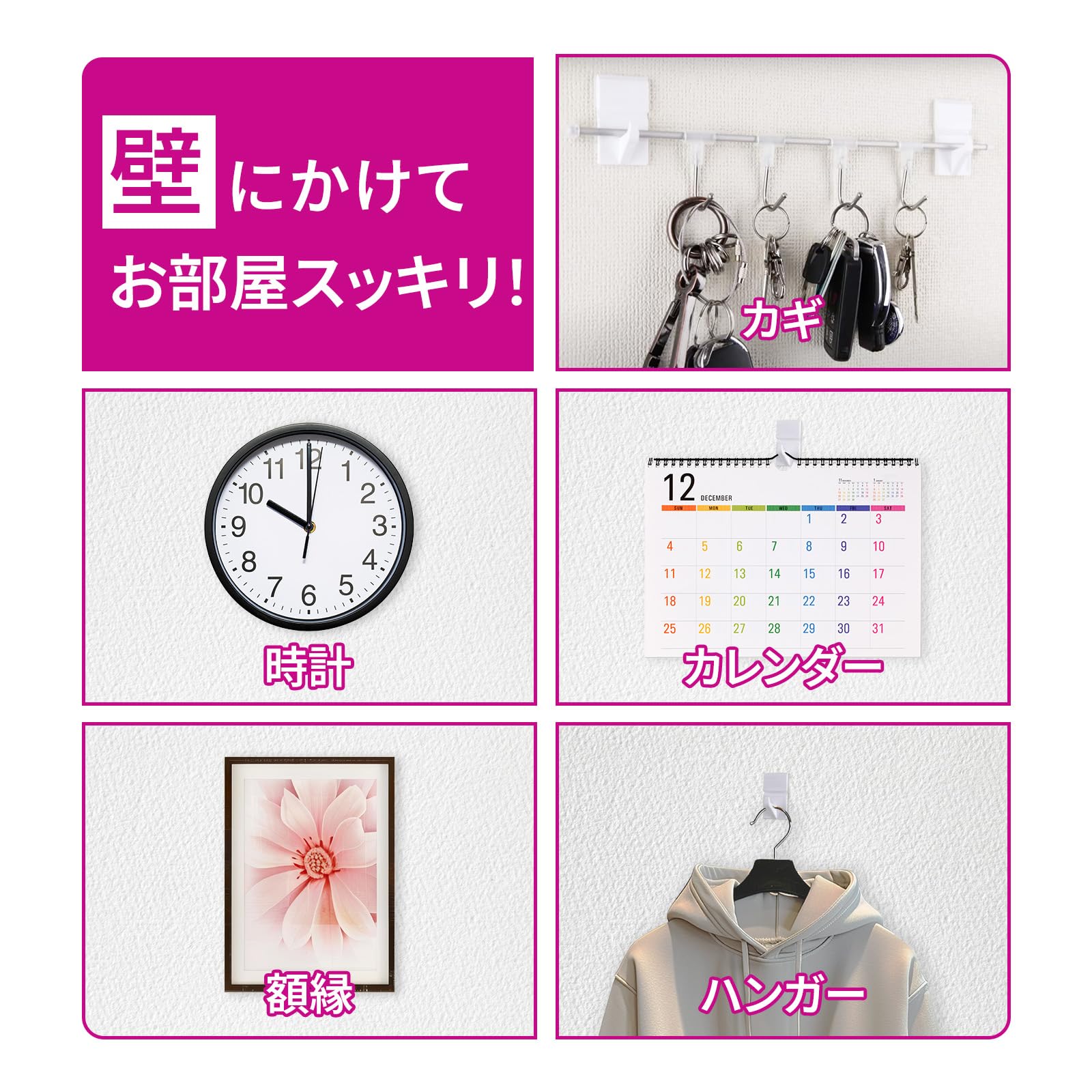 耐荷重はなんと3kg! カギ・時計・カレンダー・額縁・バッグ・ハンガー・プランターも掛けられる!壁面の有効利用で・お部屋がスッキリ!