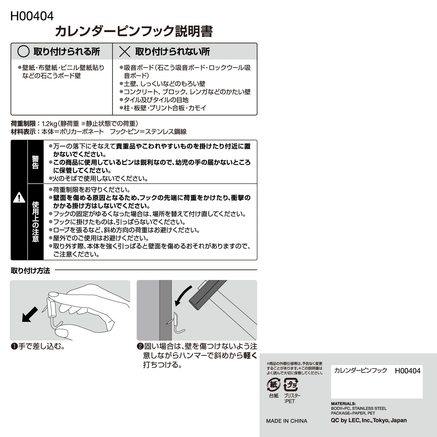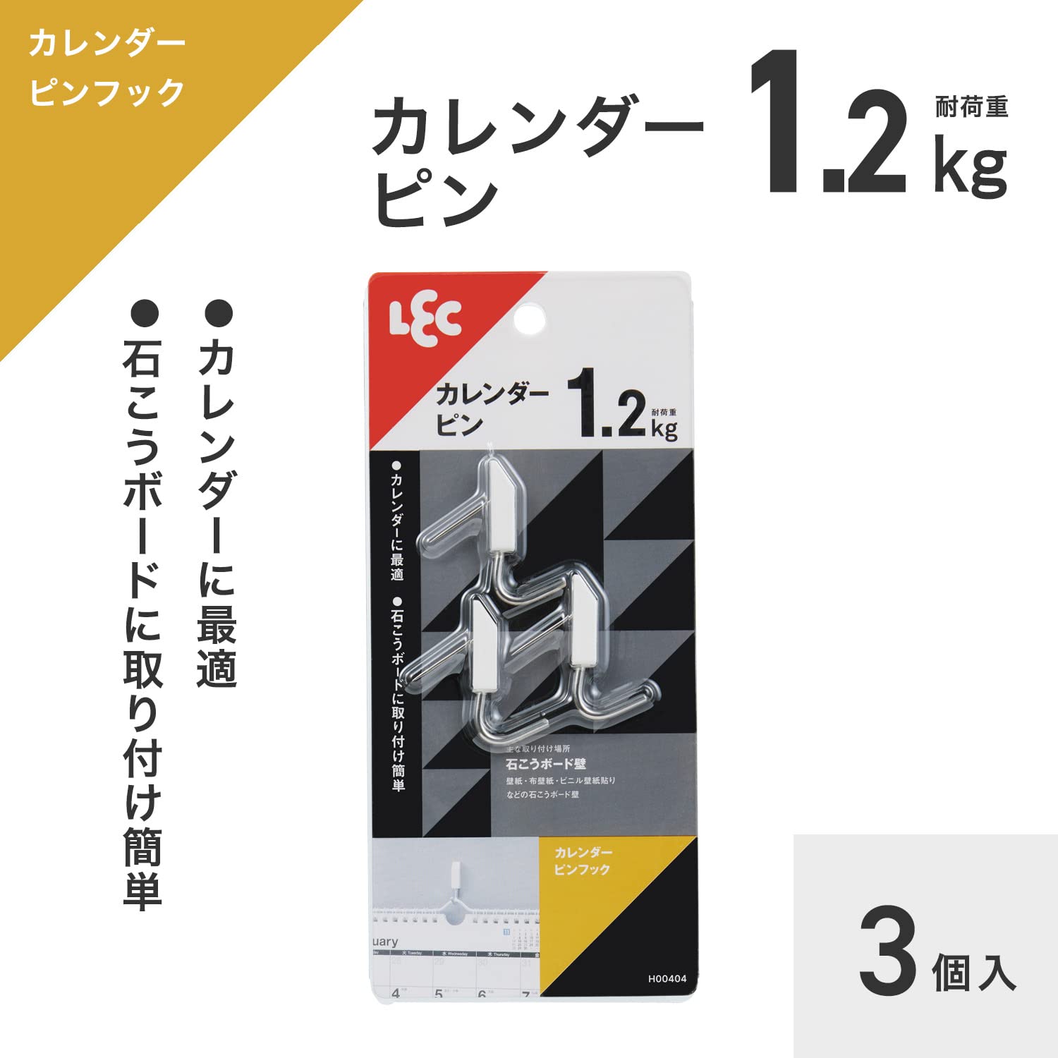 レック(LEC) カレンダーピンフック 3個入 耐荷重:1.2kg ホワイト H00404