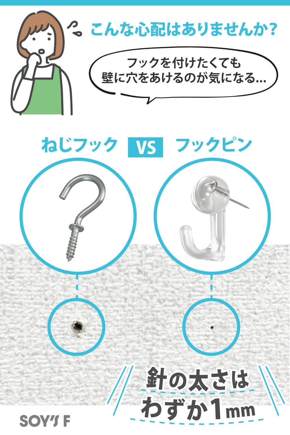 【壁を傷つけにくいピンタイプ フック】ネジ式のフックは抜いた際に穴が大きく目立ってしまいます。画鋲タイプですとピンが細いためネジ式よりも抜いた跡が小さく目立ちにくいです。