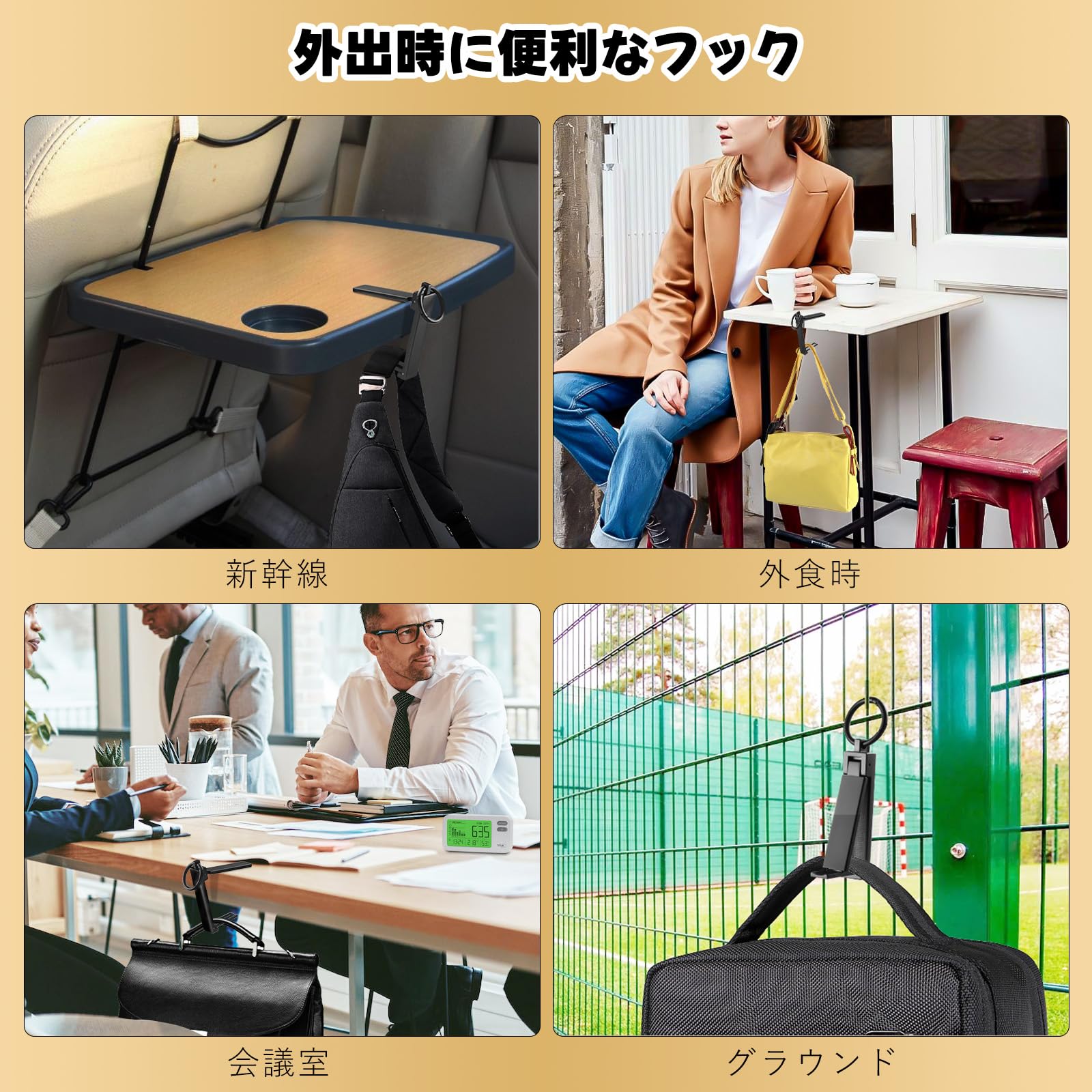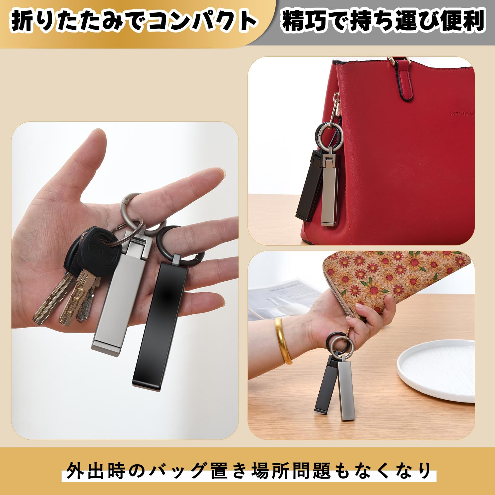 【携帯便利】バッグハンガーをバッグやキー、コインケースなどに掛けて、いつでも持ち歩けます。出張、旅行、運動場、図書館など、さまざまなシーンで活用できます。