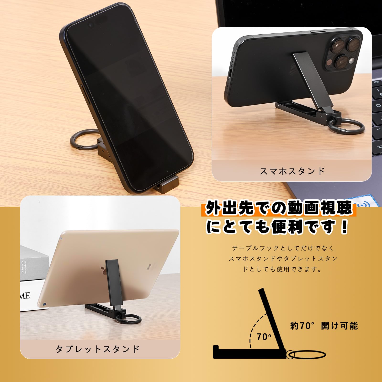 【スマホスタンド兼用】カバン掛けとして使える便利なアイテムが、スマホスタンド、タブレットスタンドとしても活躍。約70°の角度で快適に視聴でき、外出先でのバッグの置き場所や視聴の問題を一気に解消します。