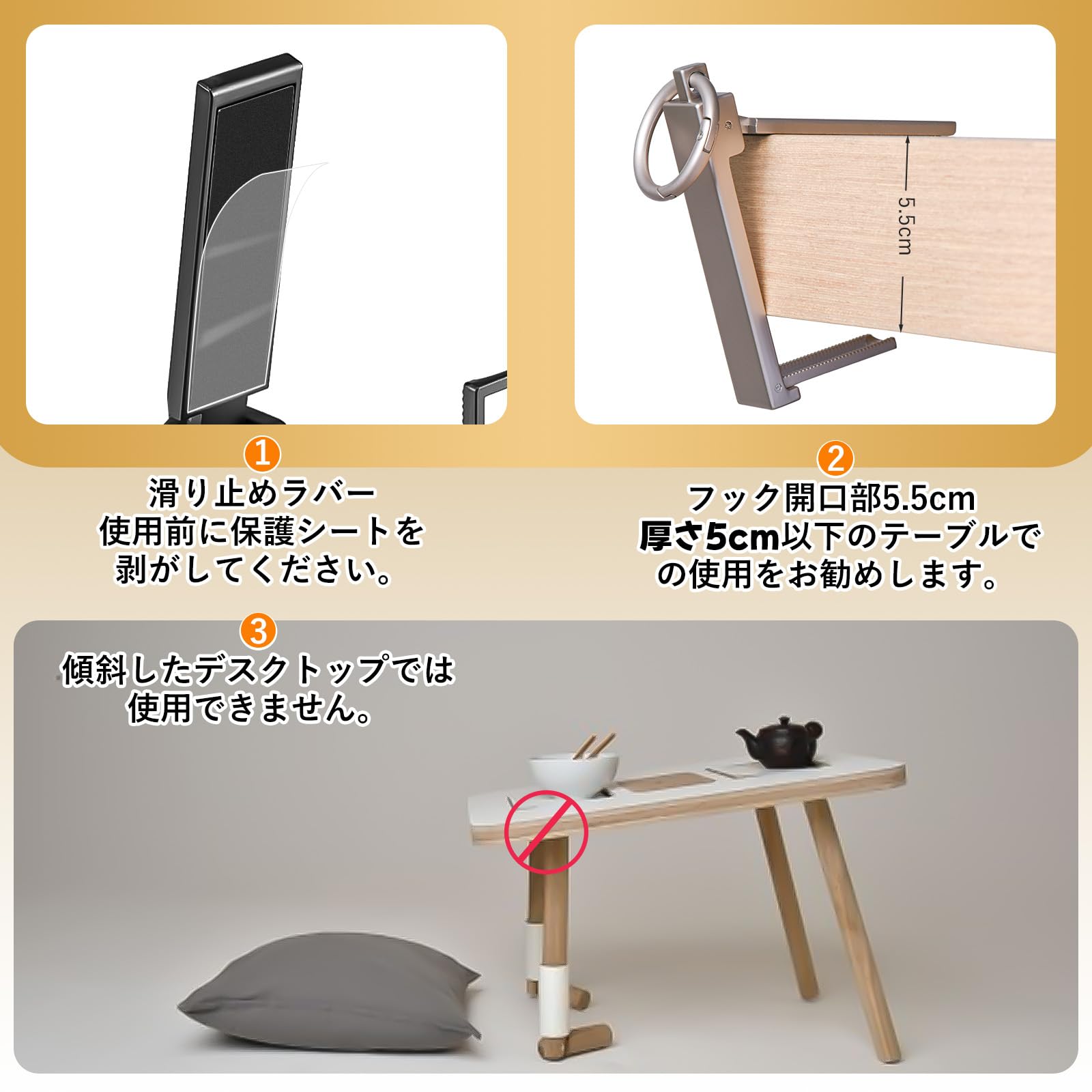 【安定性】テーブルフックが台面に接触する部分には滑り止めのラバーパッドが装備されており、フックの安定性を確保し、テーブル面の傷を防ぎます。【ご注意】使用前にラバーパッドの保護シールを剥がしてください。