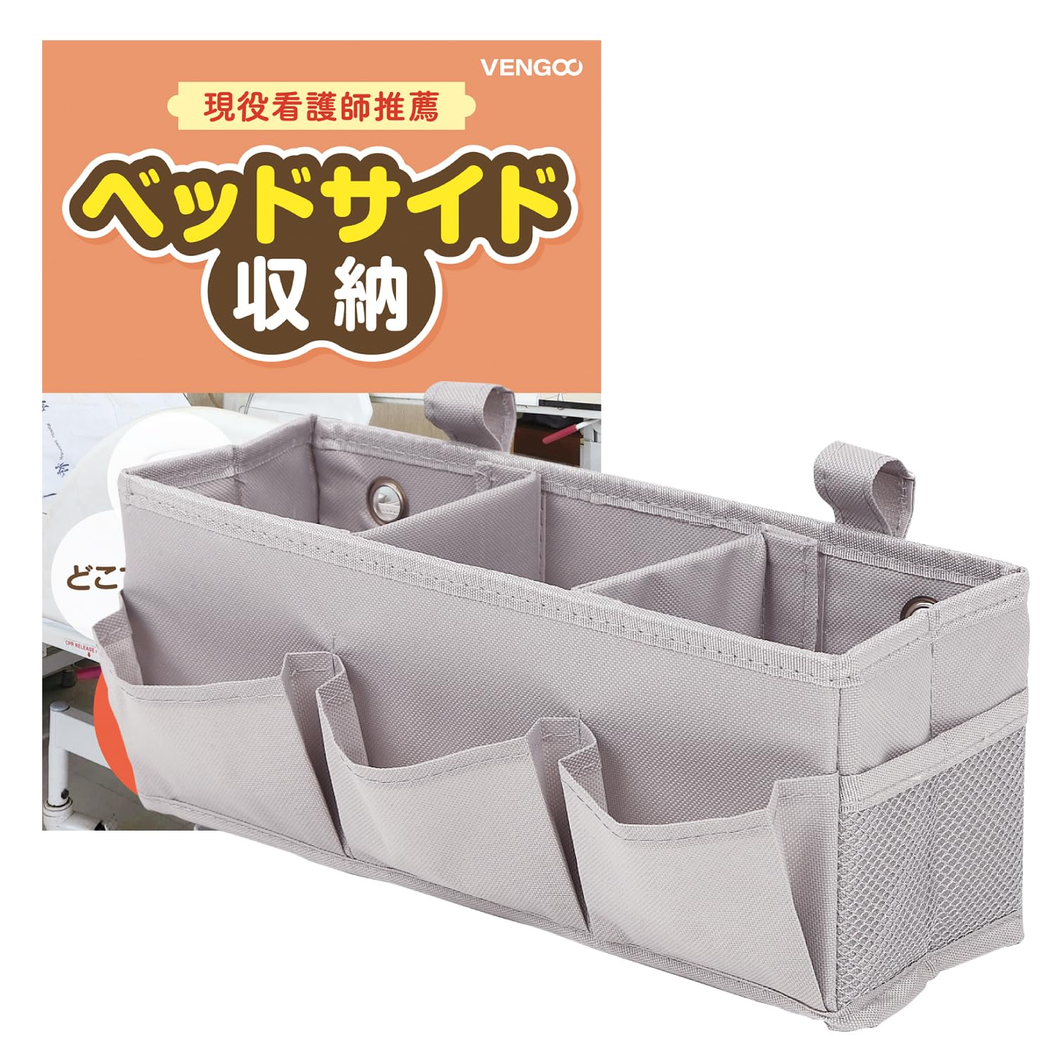 新型 浅型 ベッドサイド 収納 ベッドサイドポケット かご【高齢者施設監修】仕切り マジックテープ 車 チェア ベビーカー VENGOO グレー