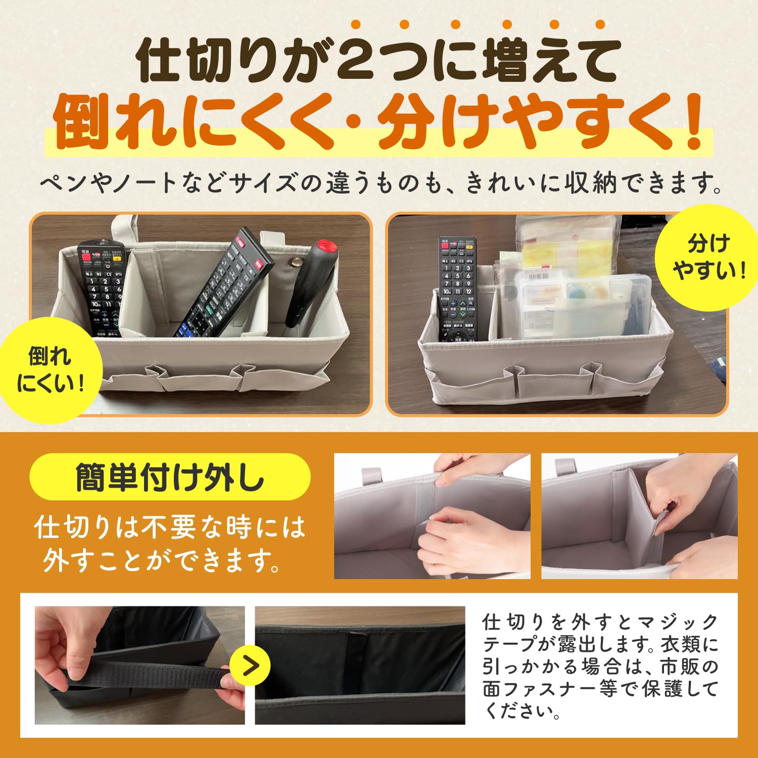 ?【仕切り付きでスッキリ整理収納】リモコン・ペン・ハサミ・体温計などの細長いアイテムが、仕切りによって倒れにくくなり、取り出しやすさがアップ。仕切りは取り外し可能なので、ノート・母子手帳・タブレットなどの大きめのアイテムにも対応可能。用途やアイテムに合わせて自由に調整できます。仕切りの数が従来の1個から2個に増え、アイテムをしっかり支えて横倒れを防止。ペンやノートなど異なるサイズのアイテムもまとめて整理でき、分類収納がさらに快適になりました。