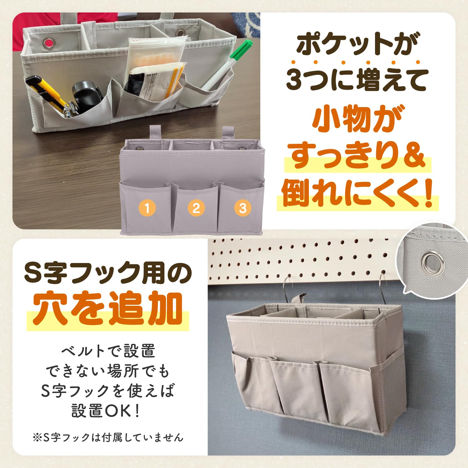 ?【2WAY取付け・幅広い対応力】新型のベッドサイド収納ポケットは、「マジックテープ式」と「フック式」の2通りの設置方法に対応。マジックテープはベッドガードや車のヘッドレスト、イスの背もたれなどにしっかりと固定でき、長さも自由に調節可能です。さらに、フック式なら有孔ボード、ソファ、パイプ椅子など、マジックテープが使えない場所にも簡単に取り付け可能。設置場所を選ばず、ベッド周りやリビング、車内などさまざまなシーンで活躍します。※S字フックは付属していません。