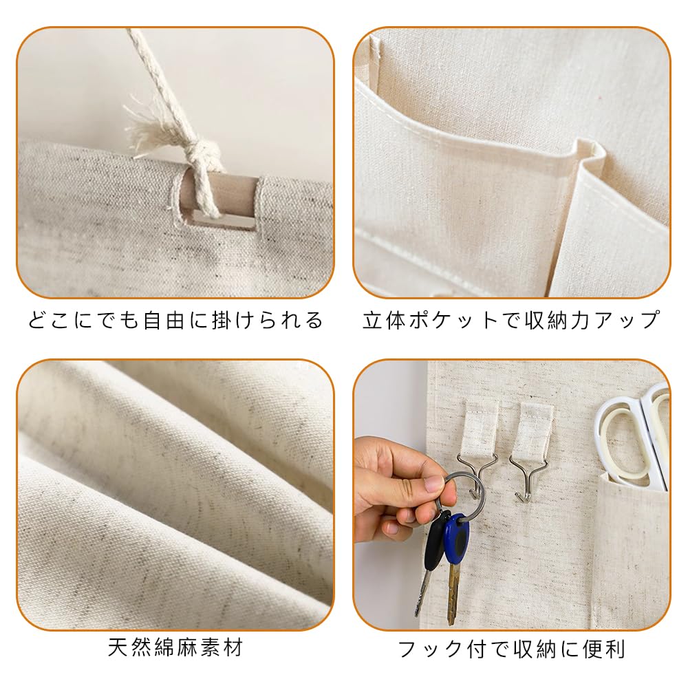 【ナチュラルな素材感】天然素材の麻と天然木を使用したウォールポケットで、シンプルながらも温かみのあるデザインが特徴です。