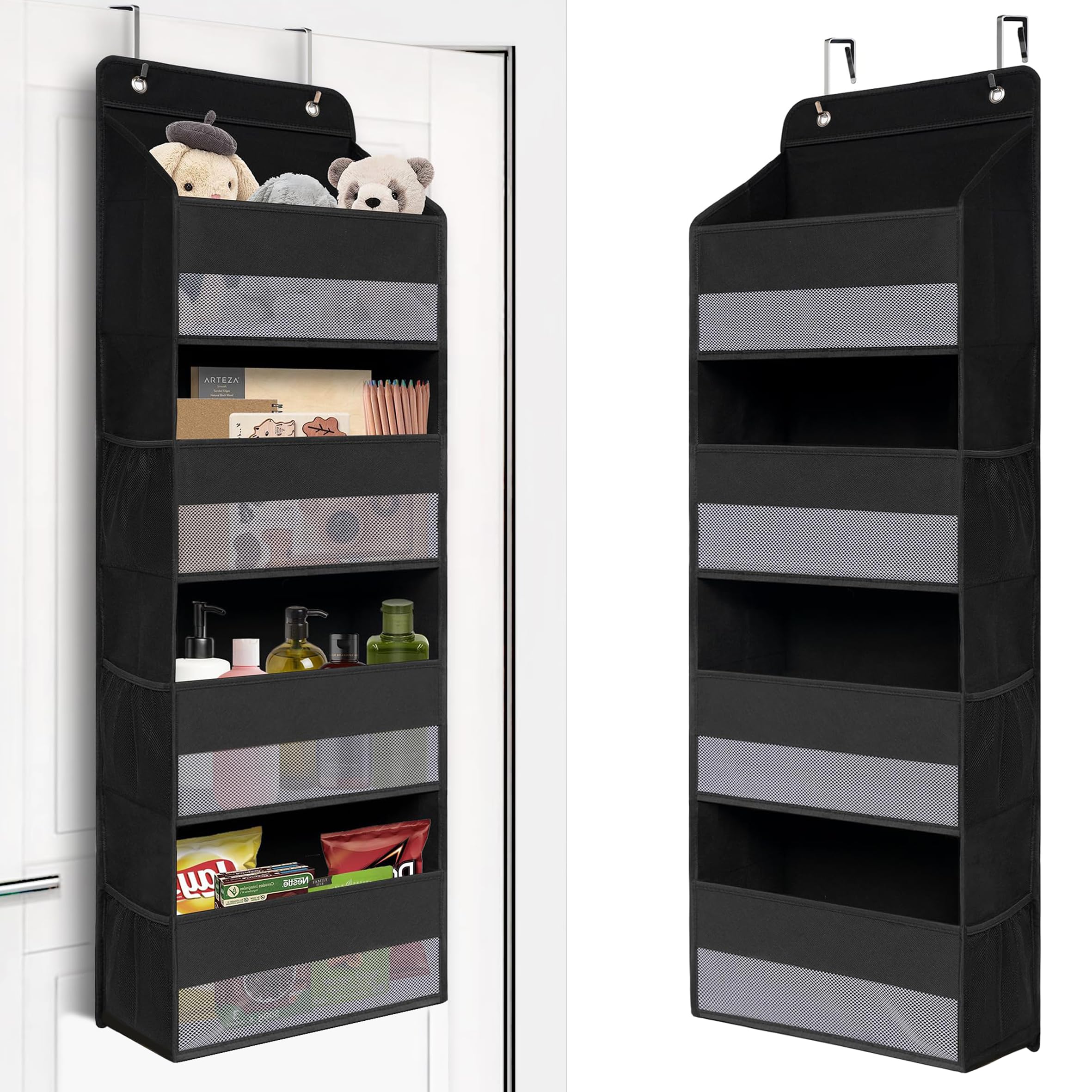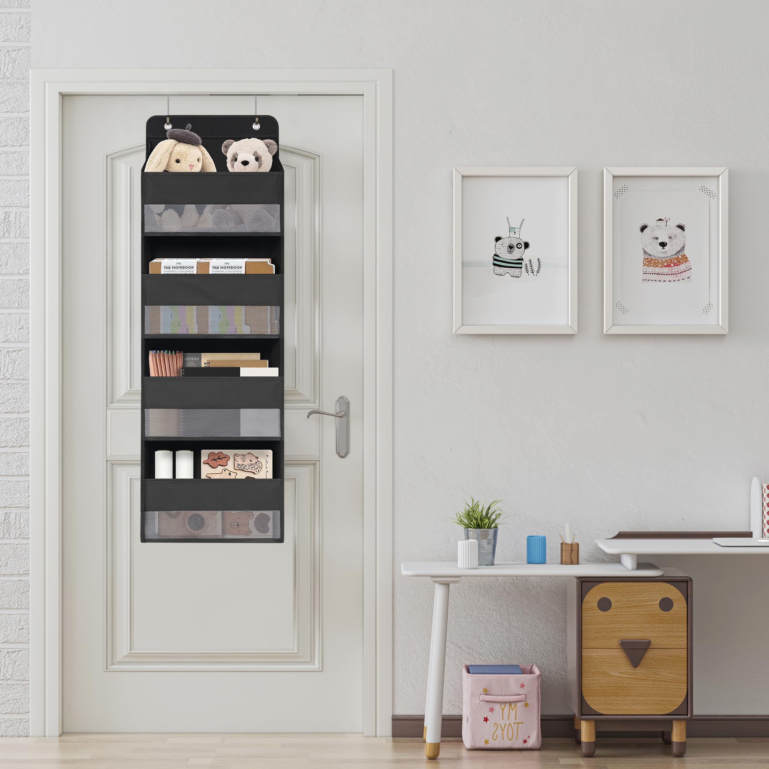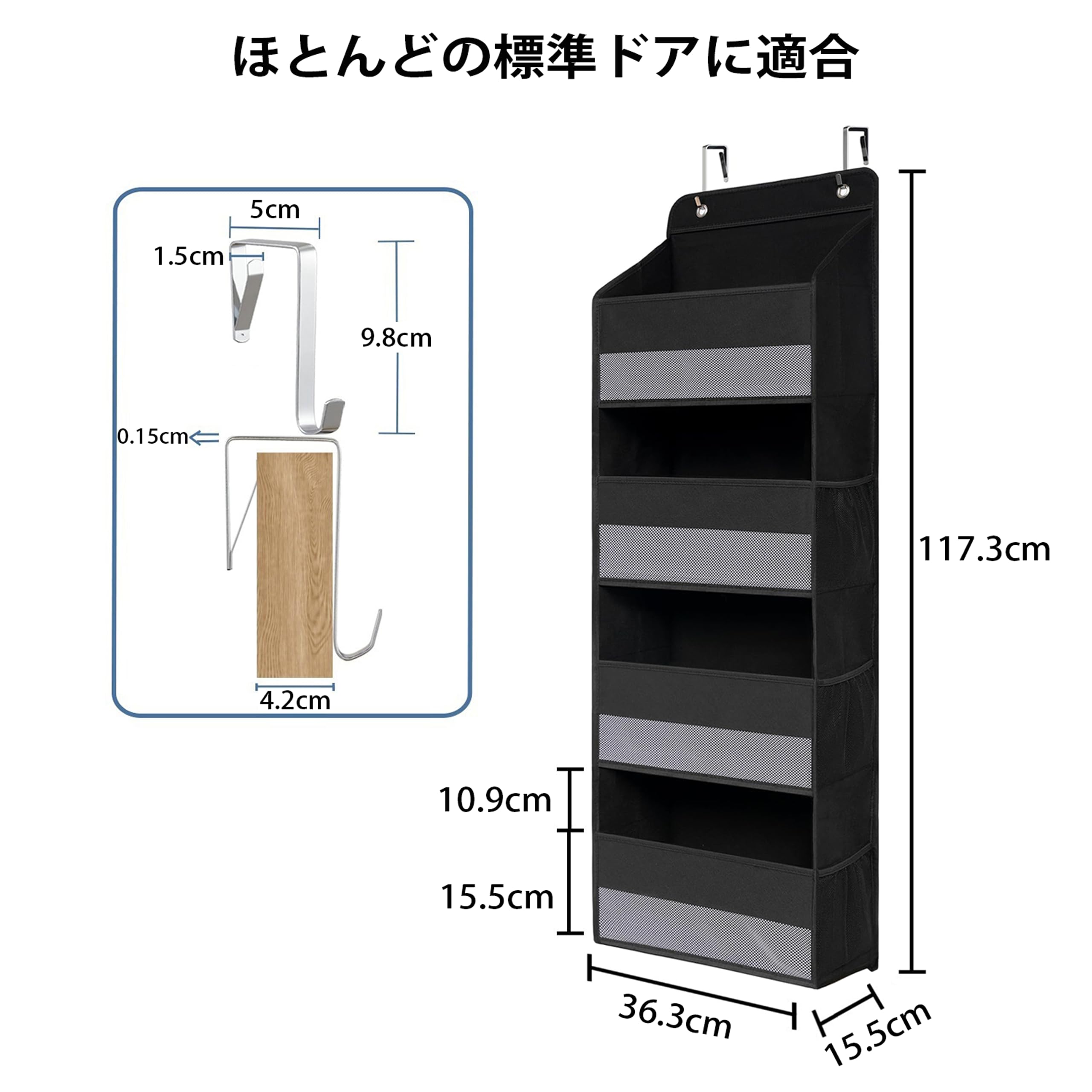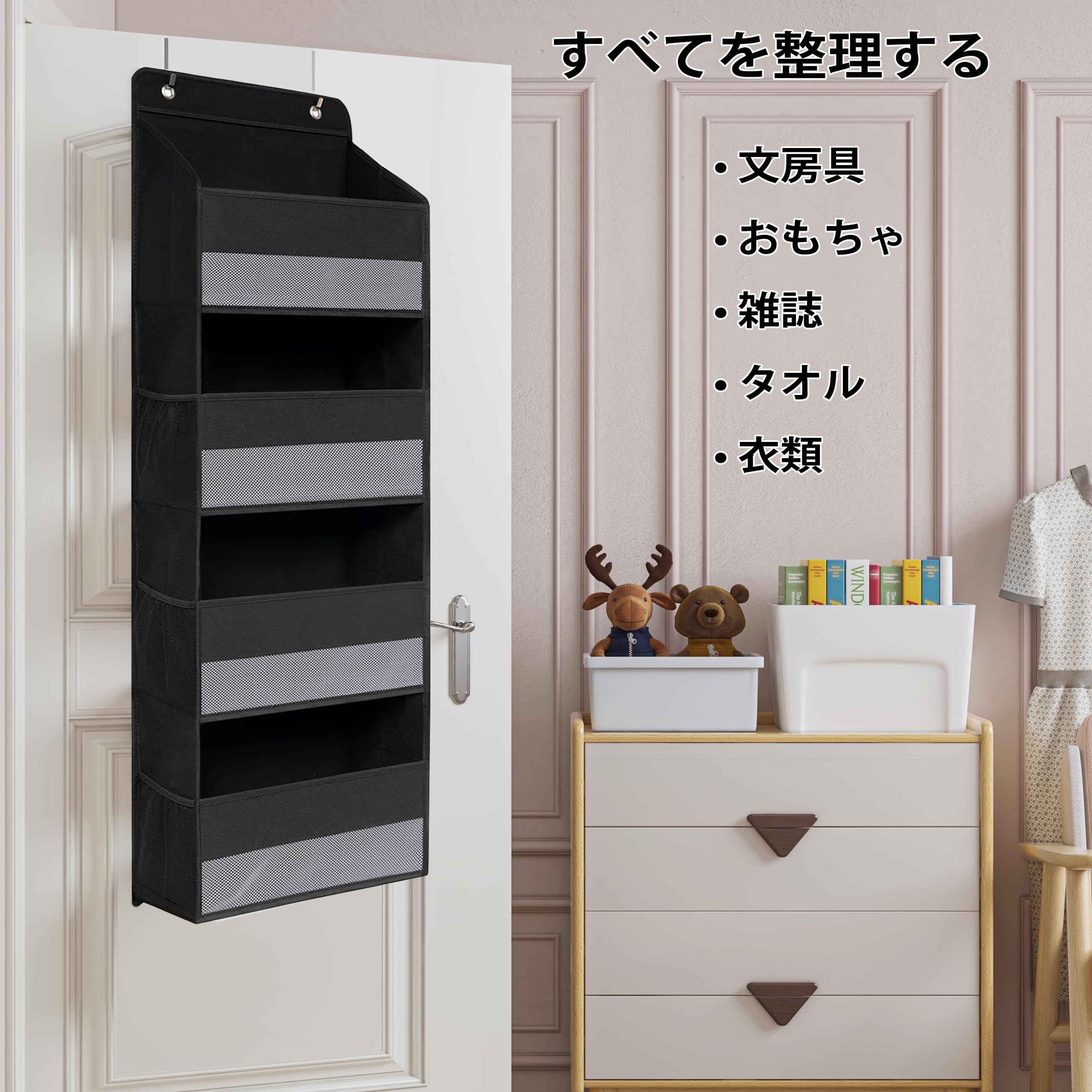 ウォールポケット 【2025新型】 ドア掛け 壁掛け 収納ポケット 4段 吊り下げ収納ポケット 大容量 不織布 頑丈 メッシュ窓 おむつ タオル 化粧品 おもちゃ 漫画 収納 弾性フック2個付き (ブラック)