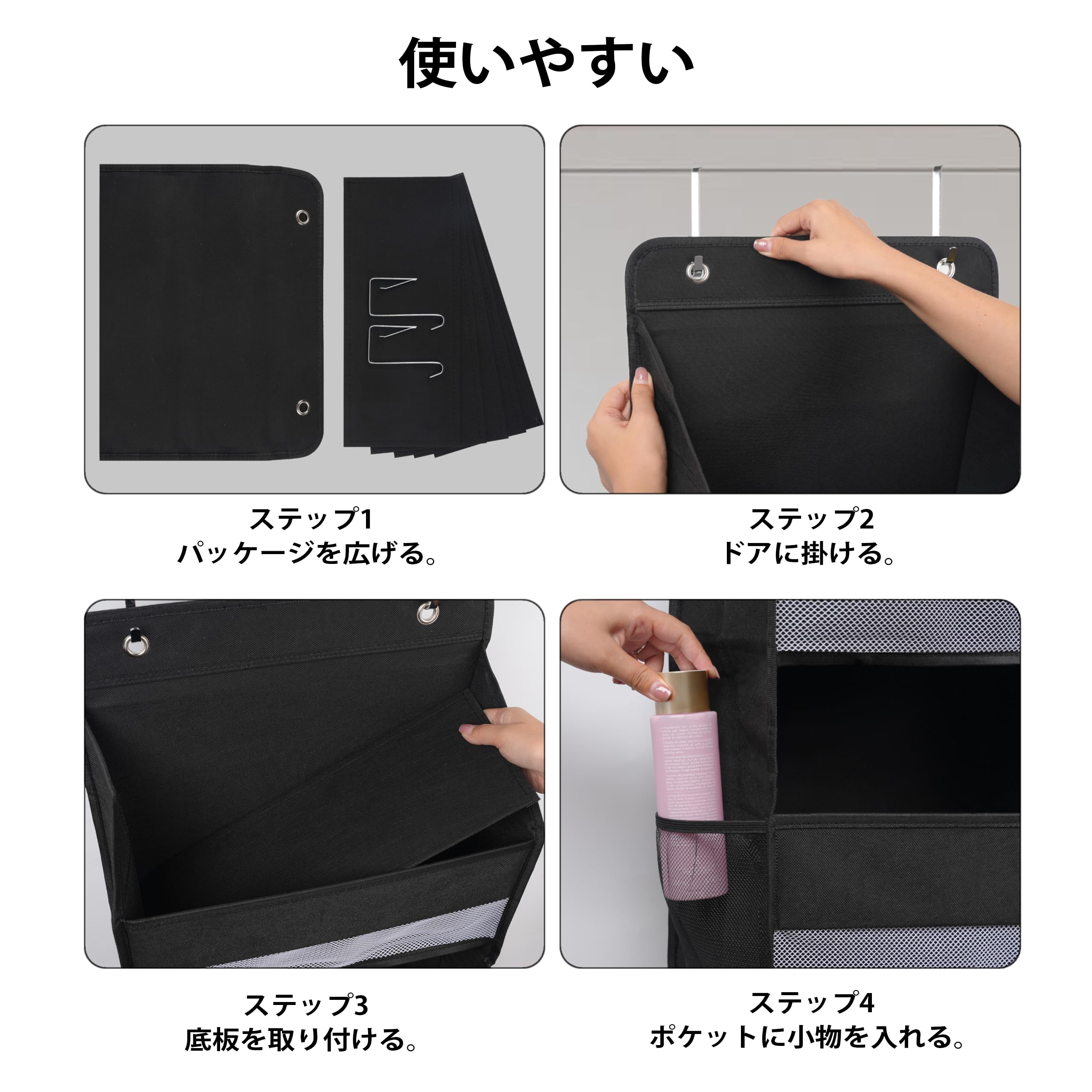 【省スペース】ドア掛け収納ポケットの2つのL字型弾性フックでほとんどのサイズのドアやラックだけでなく、釘や壁掛けフックで壁に掛けることもできます(ご注意:厚さ4.2cm以下のドアに最適)。使用しないときは、フックと底板を外して平らに折りたたむだけで、場所をとりません。