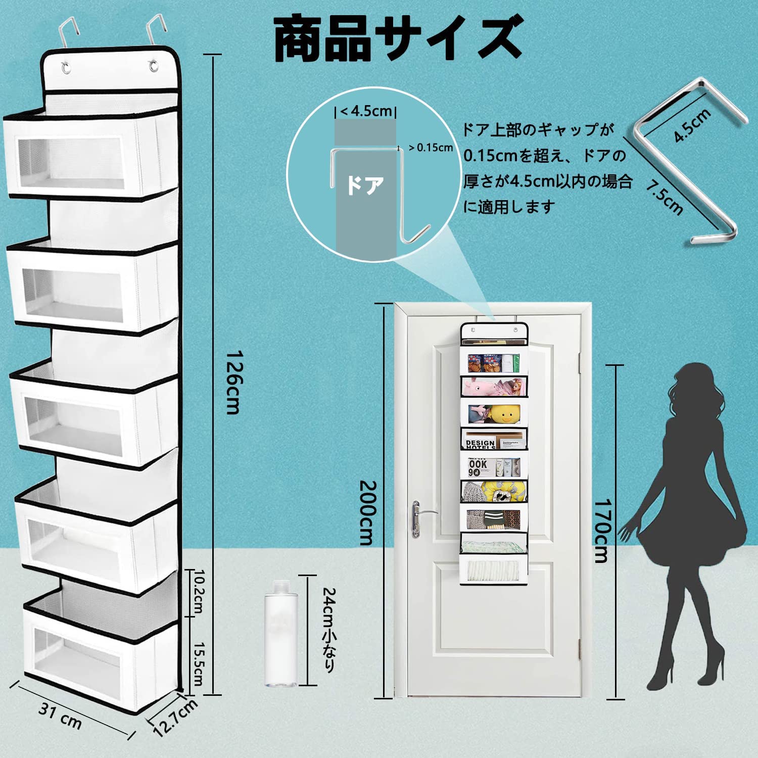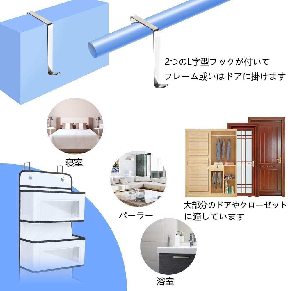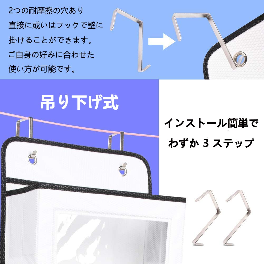 【省スペース】:折り畳み可能デザインので、使わない時はコンパクトに折り畳めるので、スペースも取らない。お好み次第で使い方自由。ドア掛け収納ポケットの2つのL字型フックでほとんどのサイズのドアやラックだけでなく、釘や壁掛けフックで壁に掛けることもできます(ご注意:ドアの厚さが4.1cm未満の場合が適しています)。