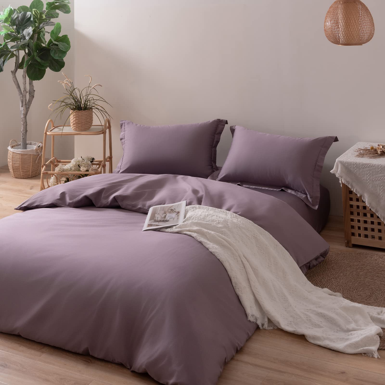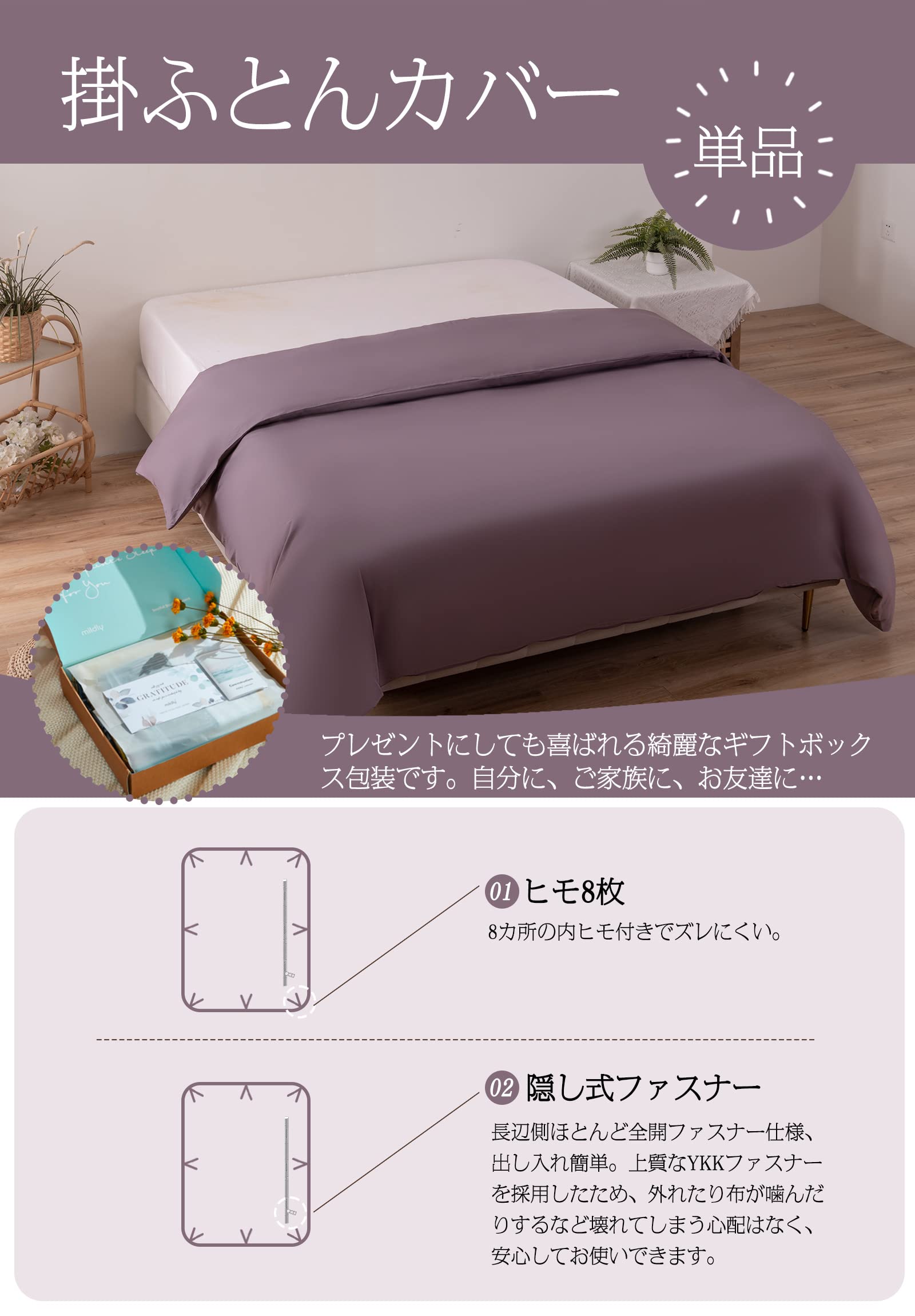 MILDLY 掛け布団カバー シングル 150x210cm 単品 オーストラリア綿100% ホテル仕様 サテン調 おしゃれ 掛ふとんカバー 150 210 ヒモ8枚 柔らかい 無地 さらさら肌触り 吸汗 速乾 【紫色・150x210cm】